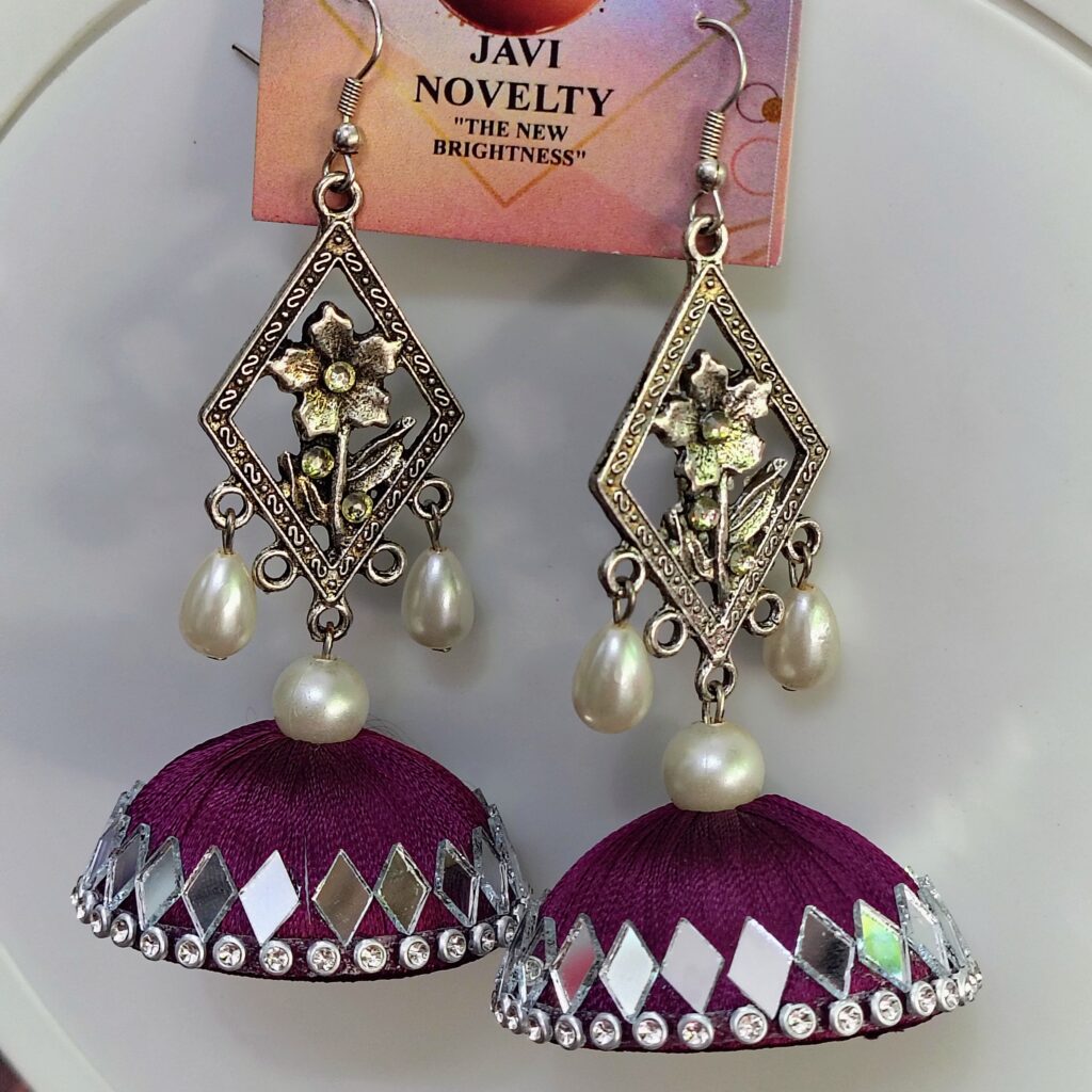 Royal Purple shade Silk Thread Jhumka Earrings with Geometric Mirror Accents, Antique Floral Top & Pearl Drops