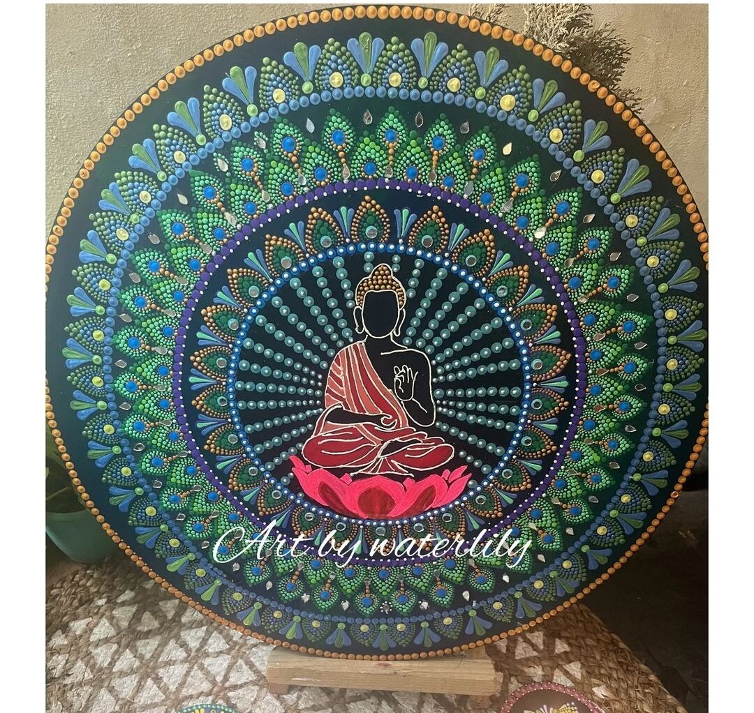 A Buddha dot mandala painting typically features a serene depiction of Buddha surrounded by intricate geometric patterns created using small dots. The central focus is on the meditative pose of Buddha, often with closed eyes and a peaceful expression. The mandala design radiates from the center, incorporating repetitive dot patterns, symbolizing unity, enlightenment, and the interconnectedness of all things. Colors are chosen thoughtfully to enhance the meditative and spiritual atmosphere of the artwork.
