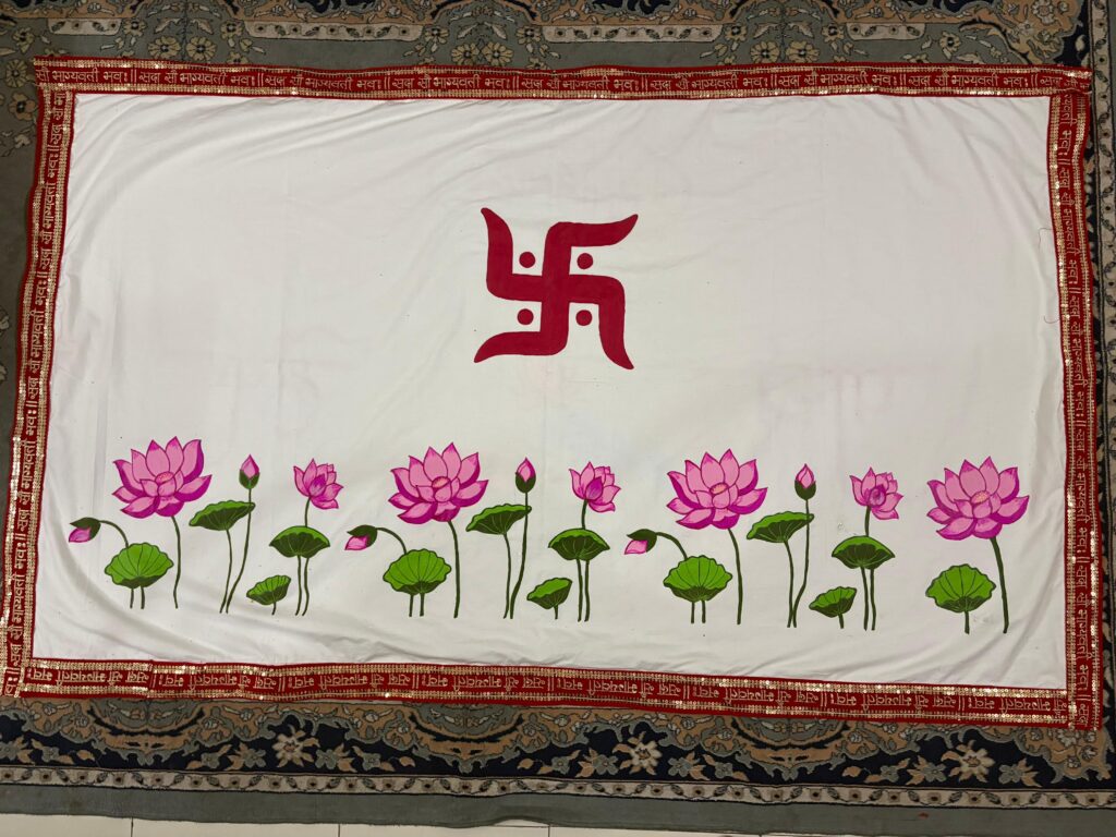 The painting frame of Meera and Krishna hand painted on a fabric sheet would be a stunning work of art. The frame would be made of high-quality wood or metal, with intricate designs and carvings that complement the painting. The colors and details of the painting would be carefully chosen to evoke the beauty and depth of Meera and Krishna’s love story.