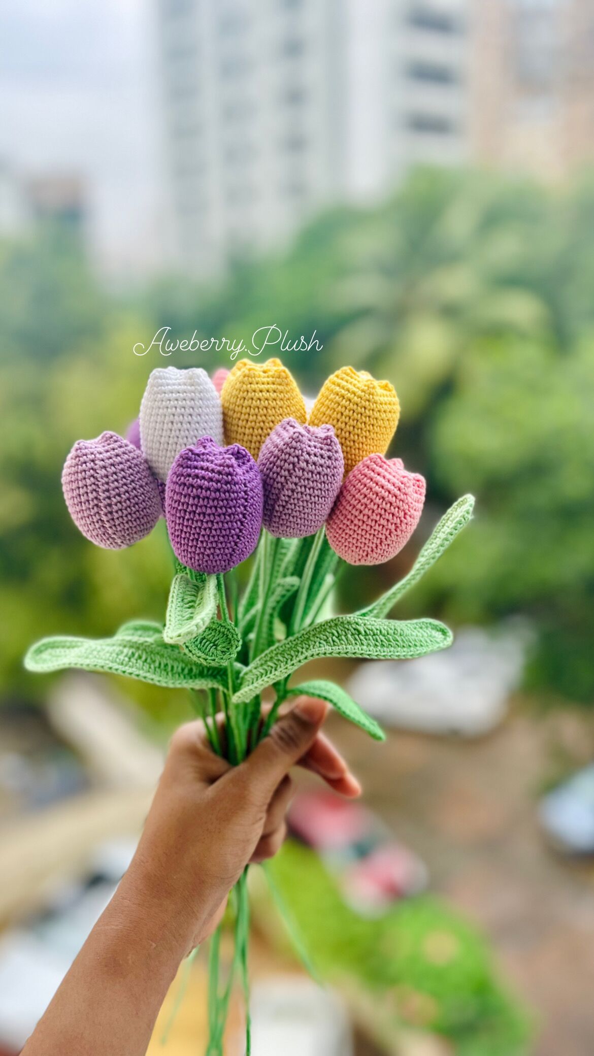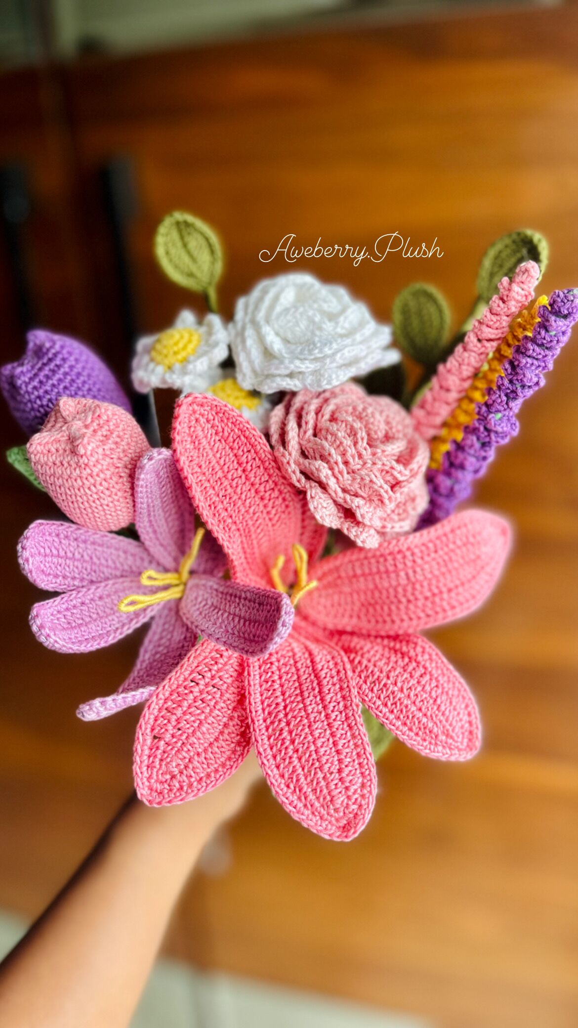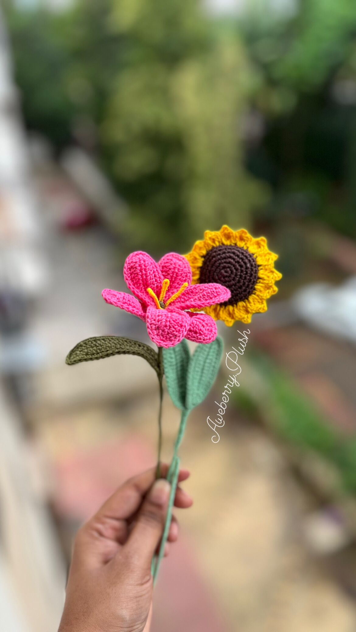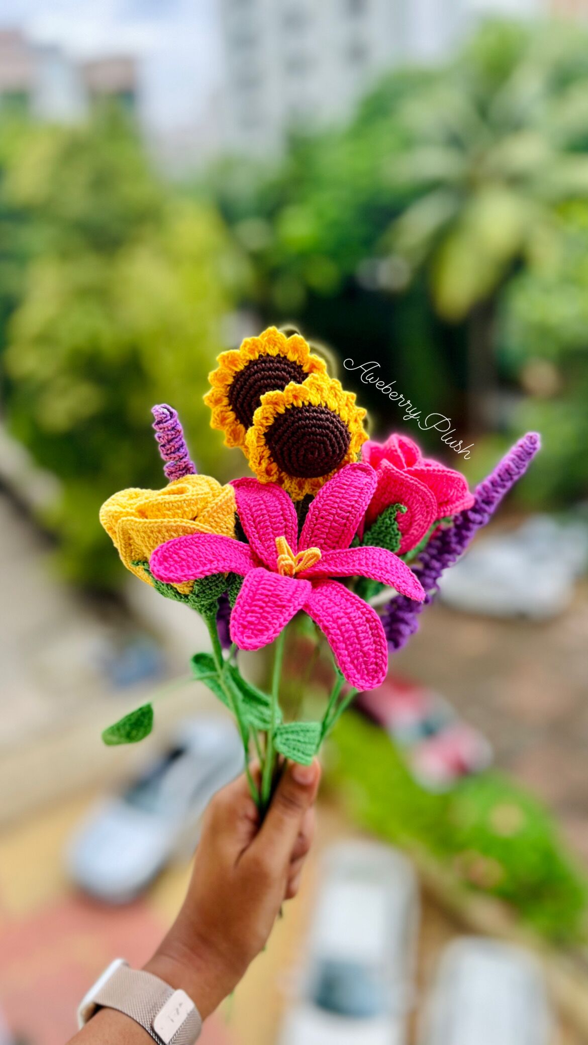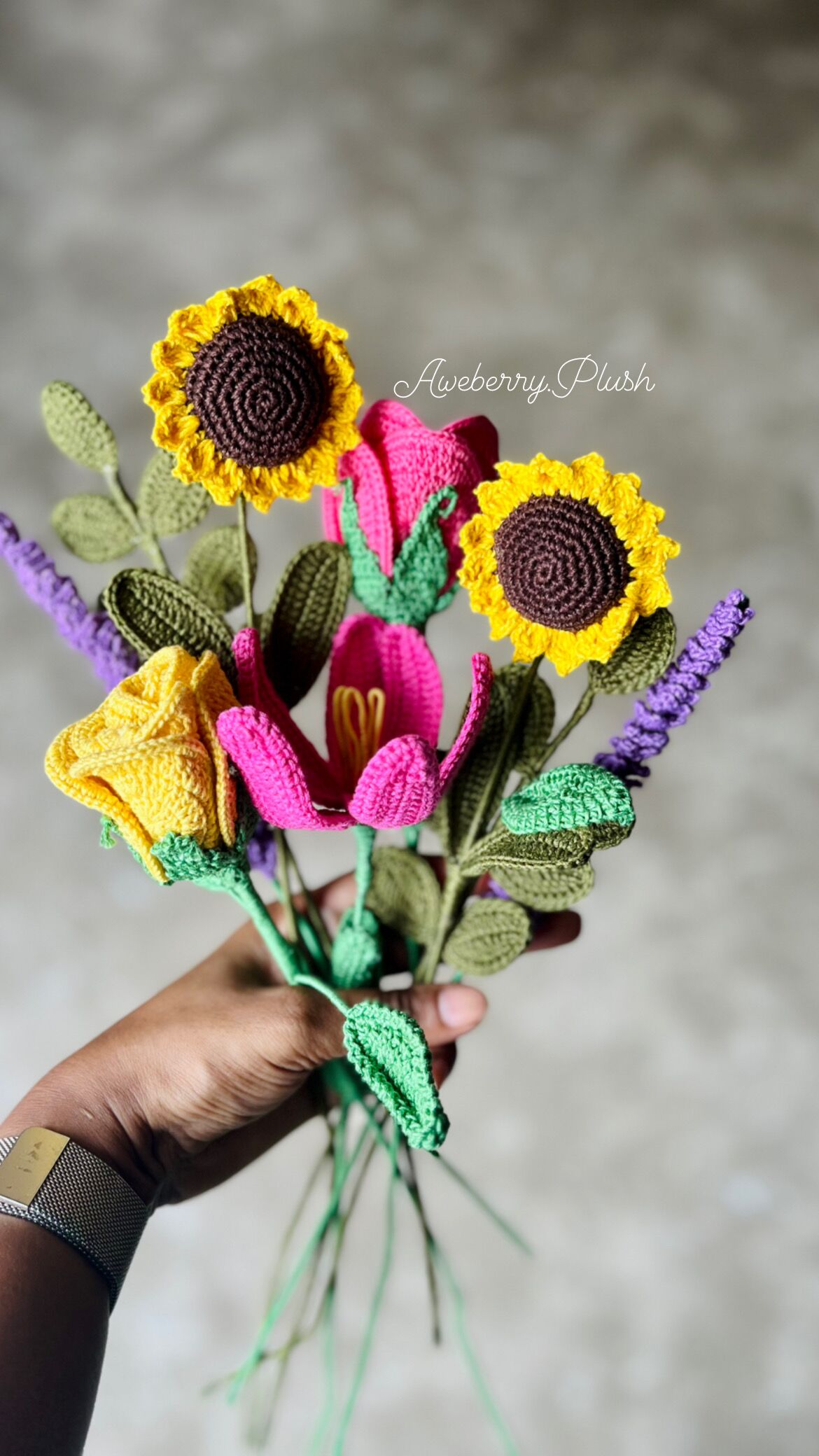 Handmade Crochet forever flowers – forever yours ! Customise your own bouquet with different varieties of flowers like chamomile, rose, rose buds, tulips , tulip buds, sunflowers, lily, lavender sticks, green stem sticks and more