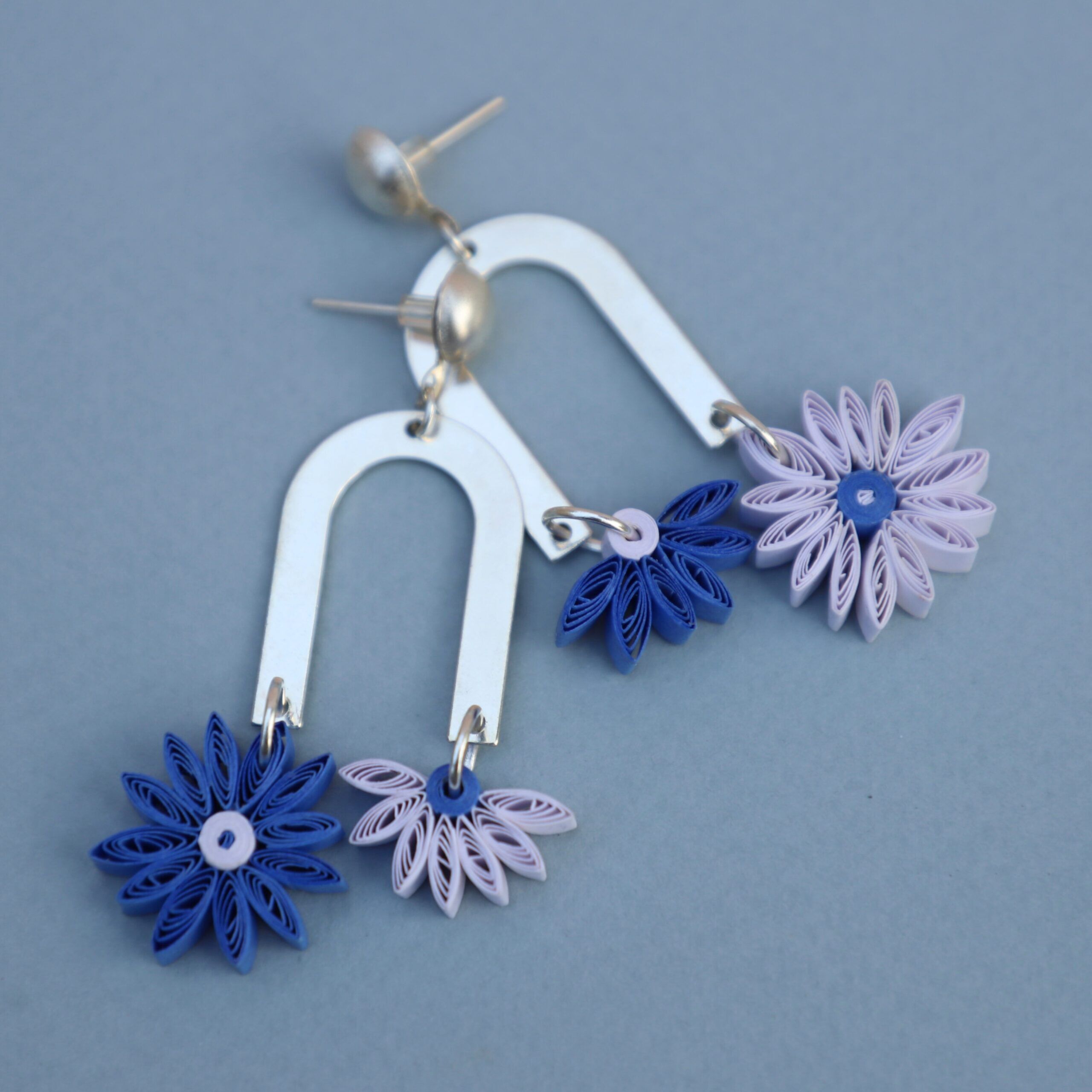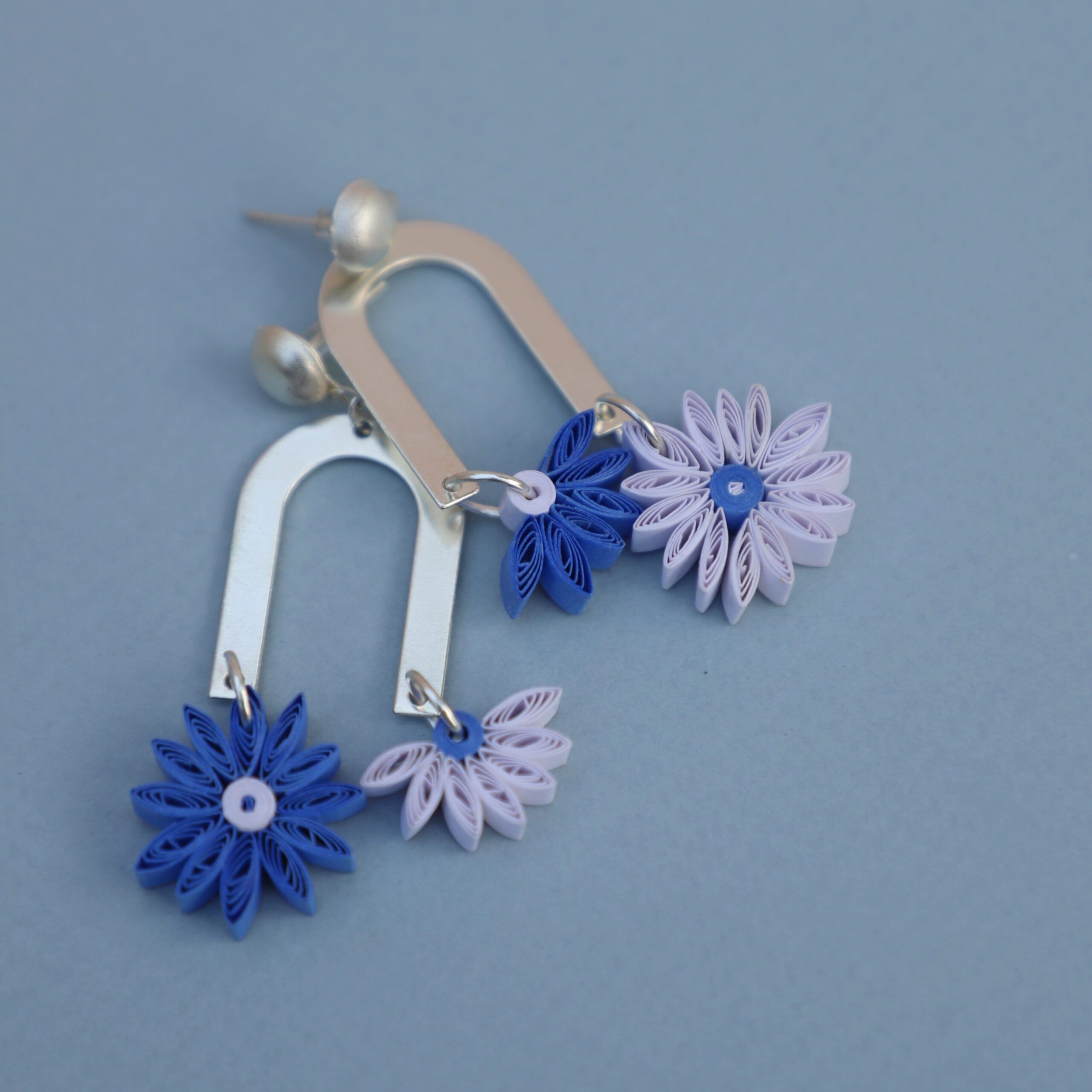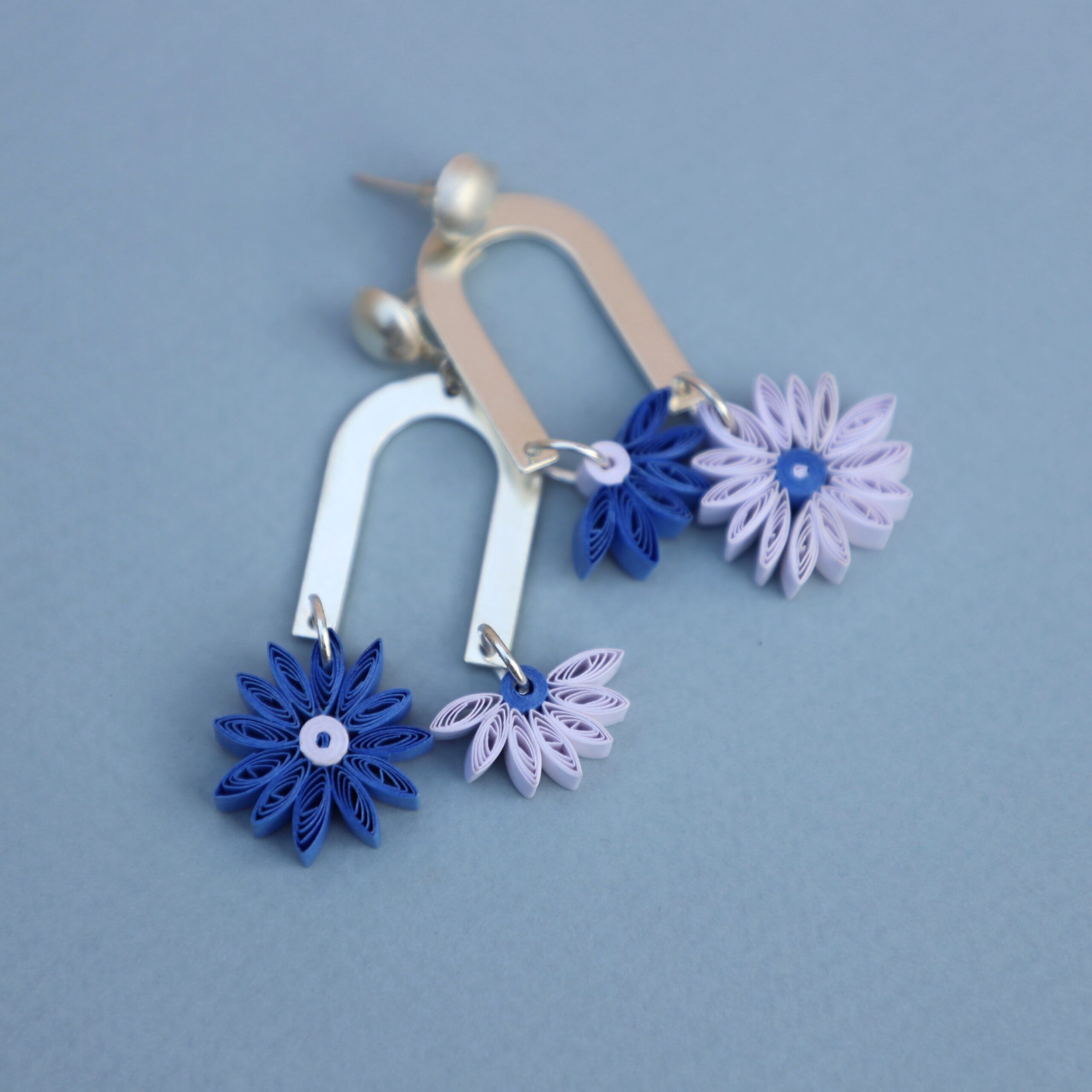 Aster Floral Hues| Paper Flower Earrings| Unique & Trendy| Anniversary Gifts| Mismatched| Gifts for Her| Handmade Gifts| Friends| Blue & White| Elegant Jewellery| Dainty Silver Dangles| Quilling Jewelry|