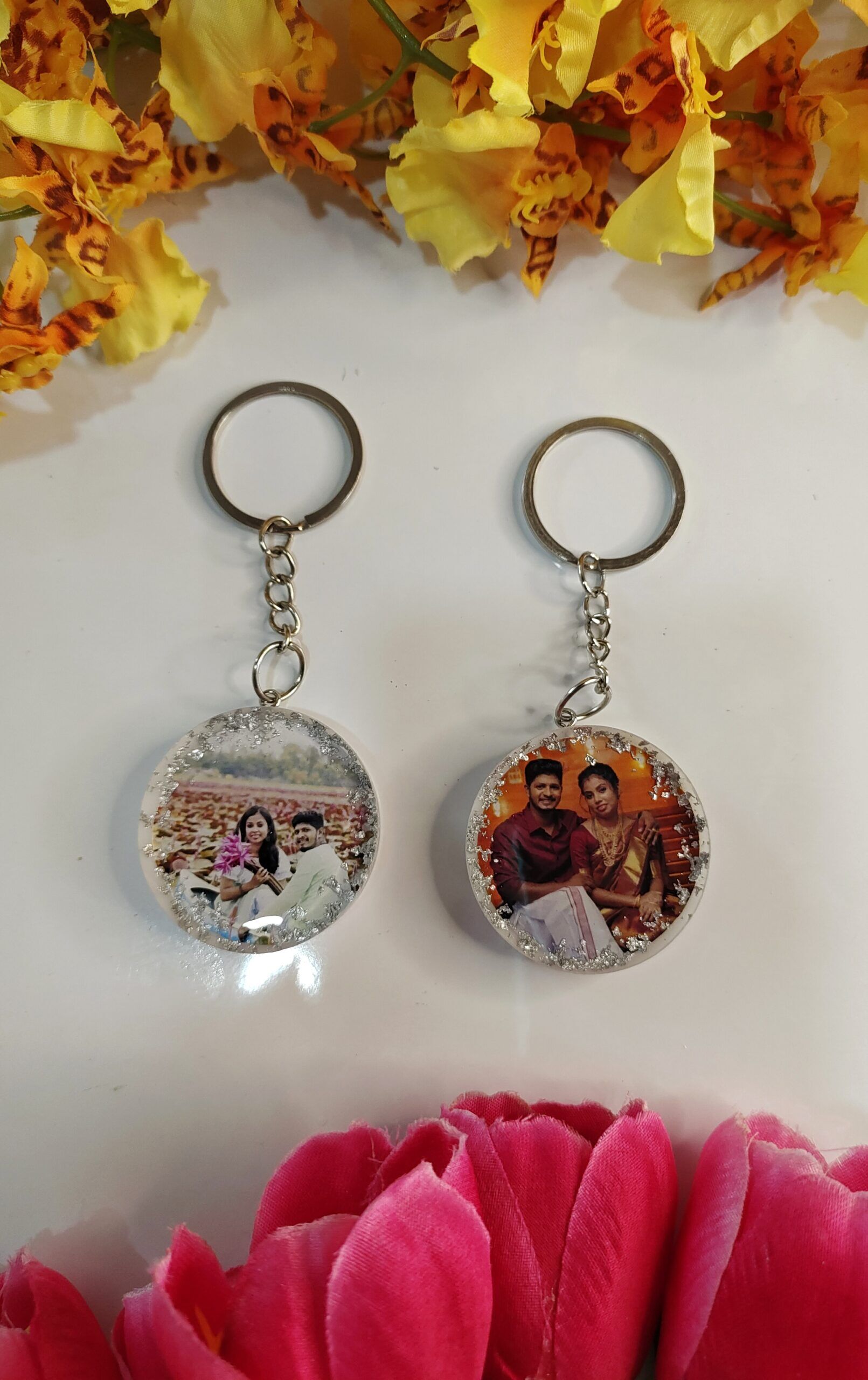 (1 customer review) Resin Photo keychains | Customized resin Art Keychain for Wedding return Gift | Personalized Photo Keychain Circle Shape