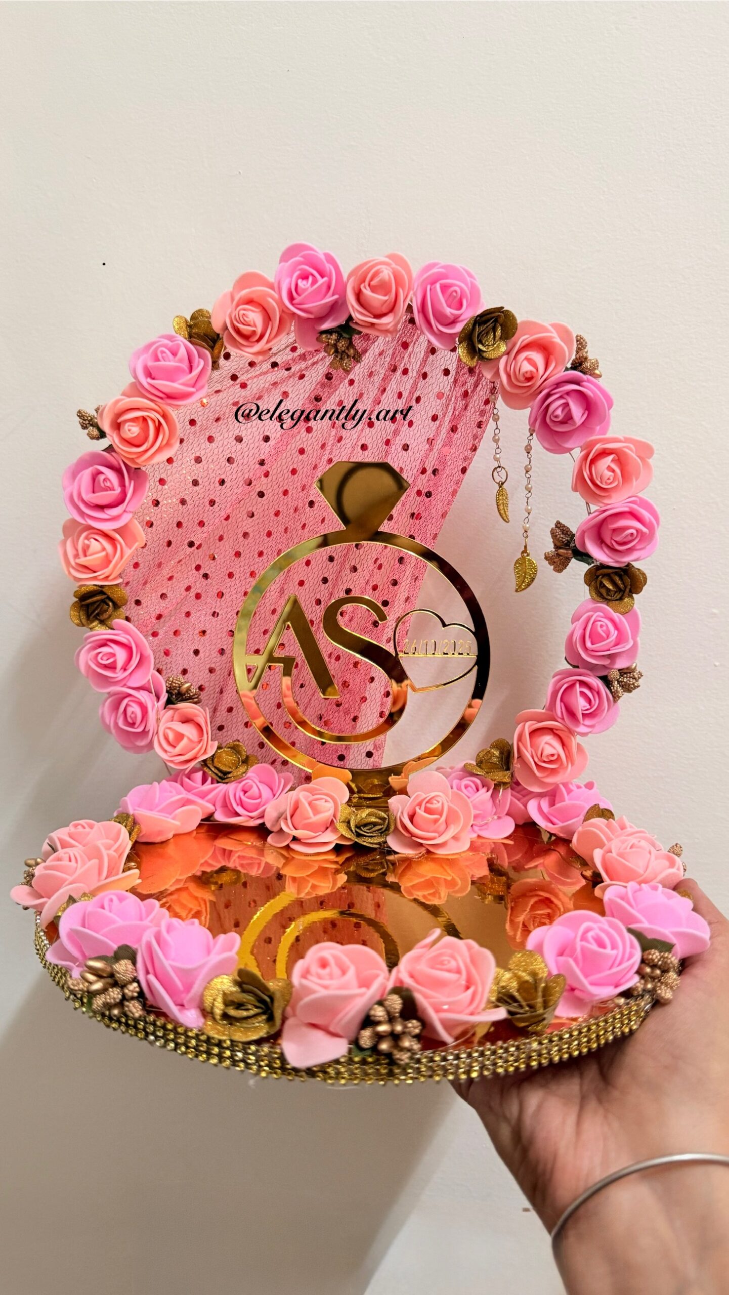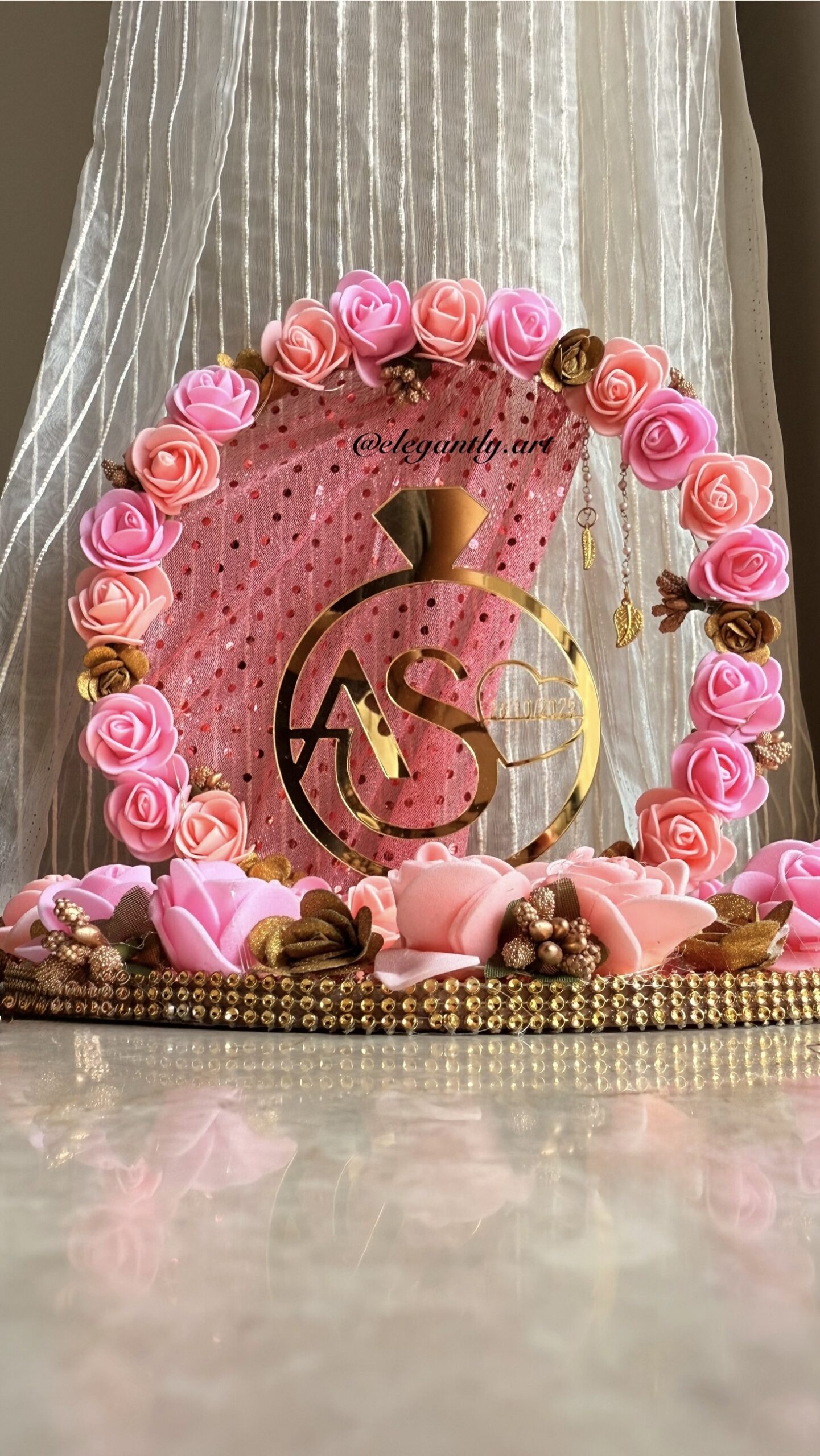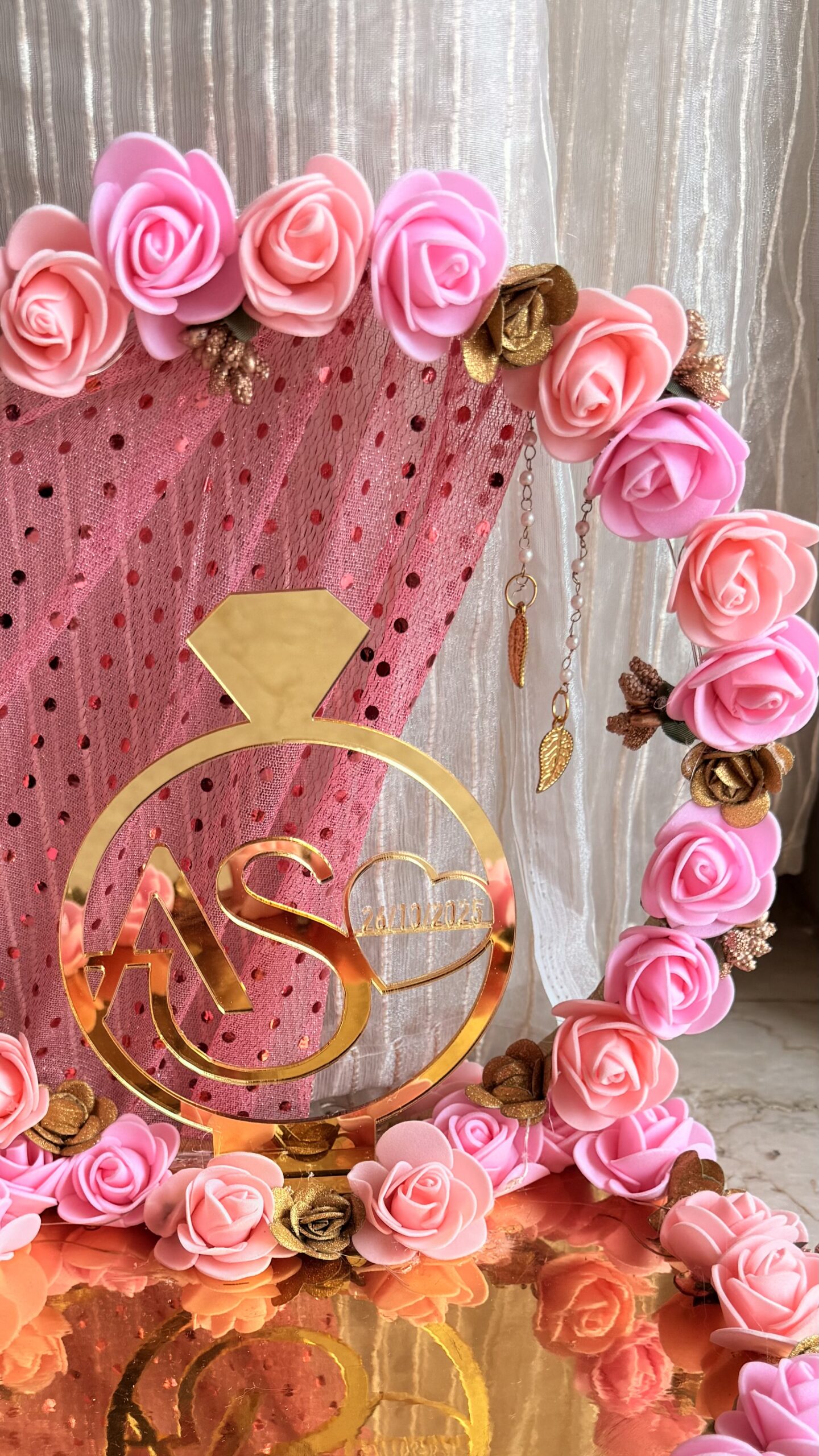 Celebrate your special moments with our beautifully handcrafted Engagement Ring Platter, designed to add elegance and charm to your ring ceremony. This exquisite platter features a mirror-gold base adorned with delicate handcrafted pink and peach roses, highlighted with golden floral accents for a luxurious finish. The round backdrop is dressed in soft pink net with tiny polka detailing, framed with matching florals to create a dreamy, romantic aesthetic. At the center sits a stunning customizable golden monogram—perfect for adding the couple’s initials or a special date. The hanging golden leaf charms add a graceful, modern touch, making the platter a true keepsake. ⸻ Features