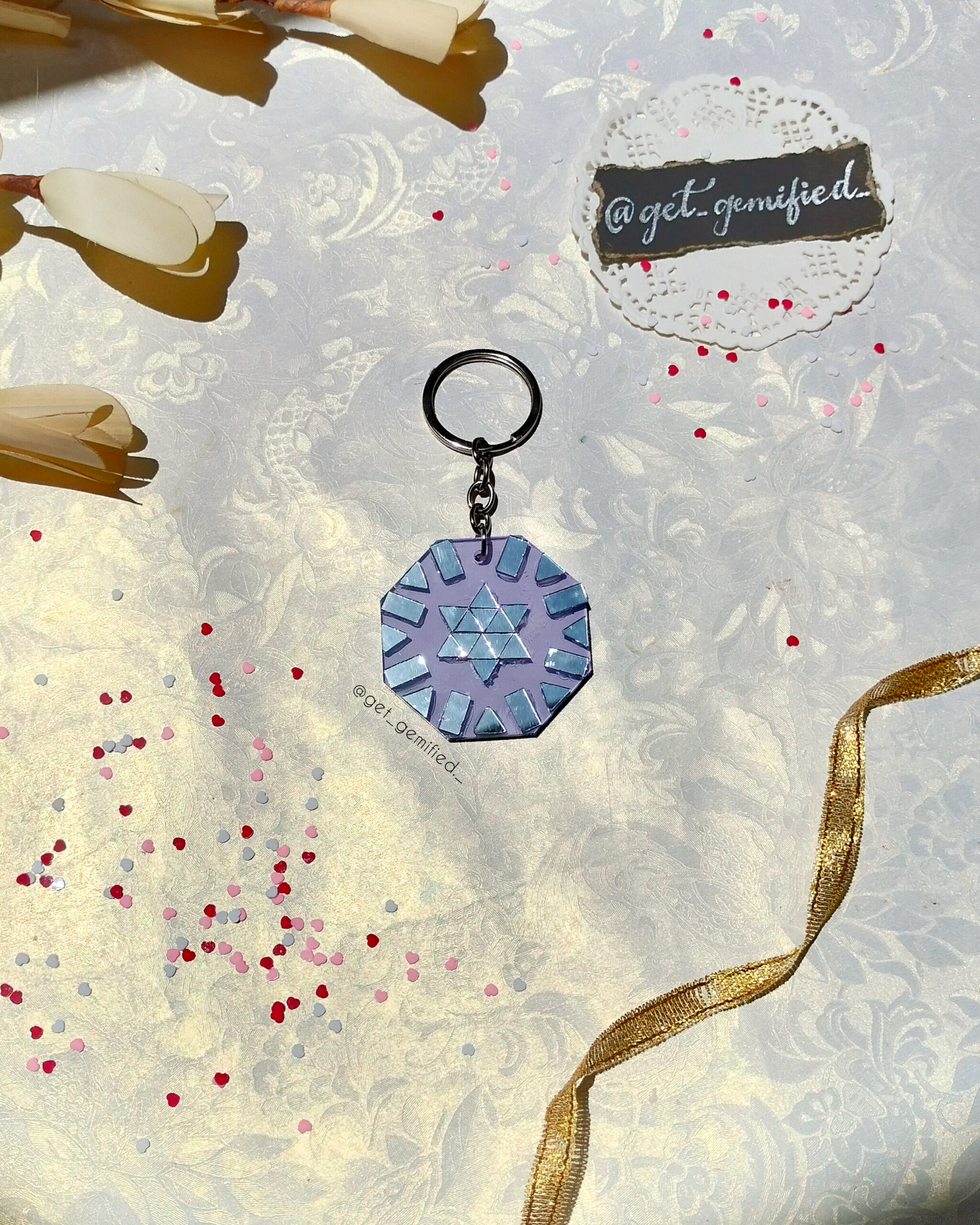 Acrylic base decorated with mirror work, offering a sleek and colorful surface that catches the eye.