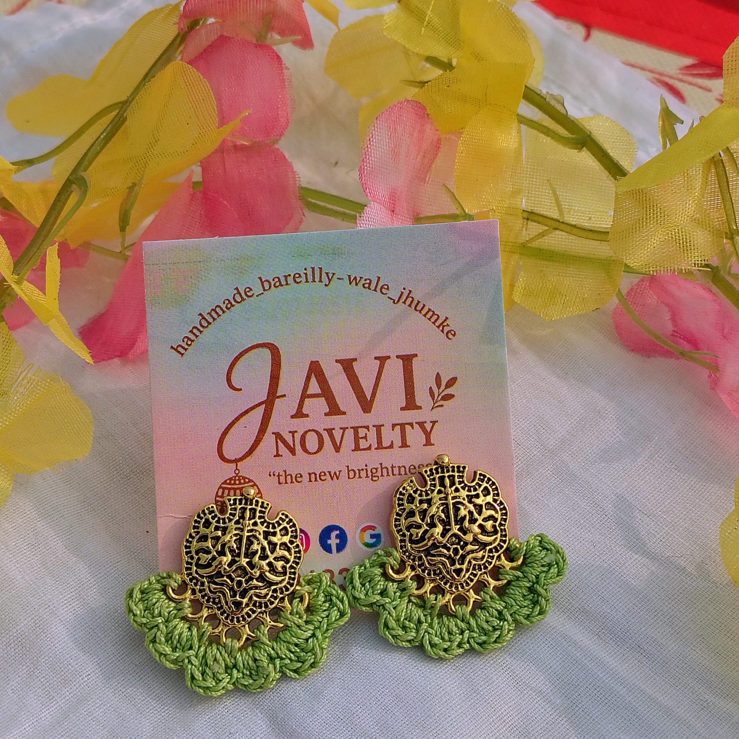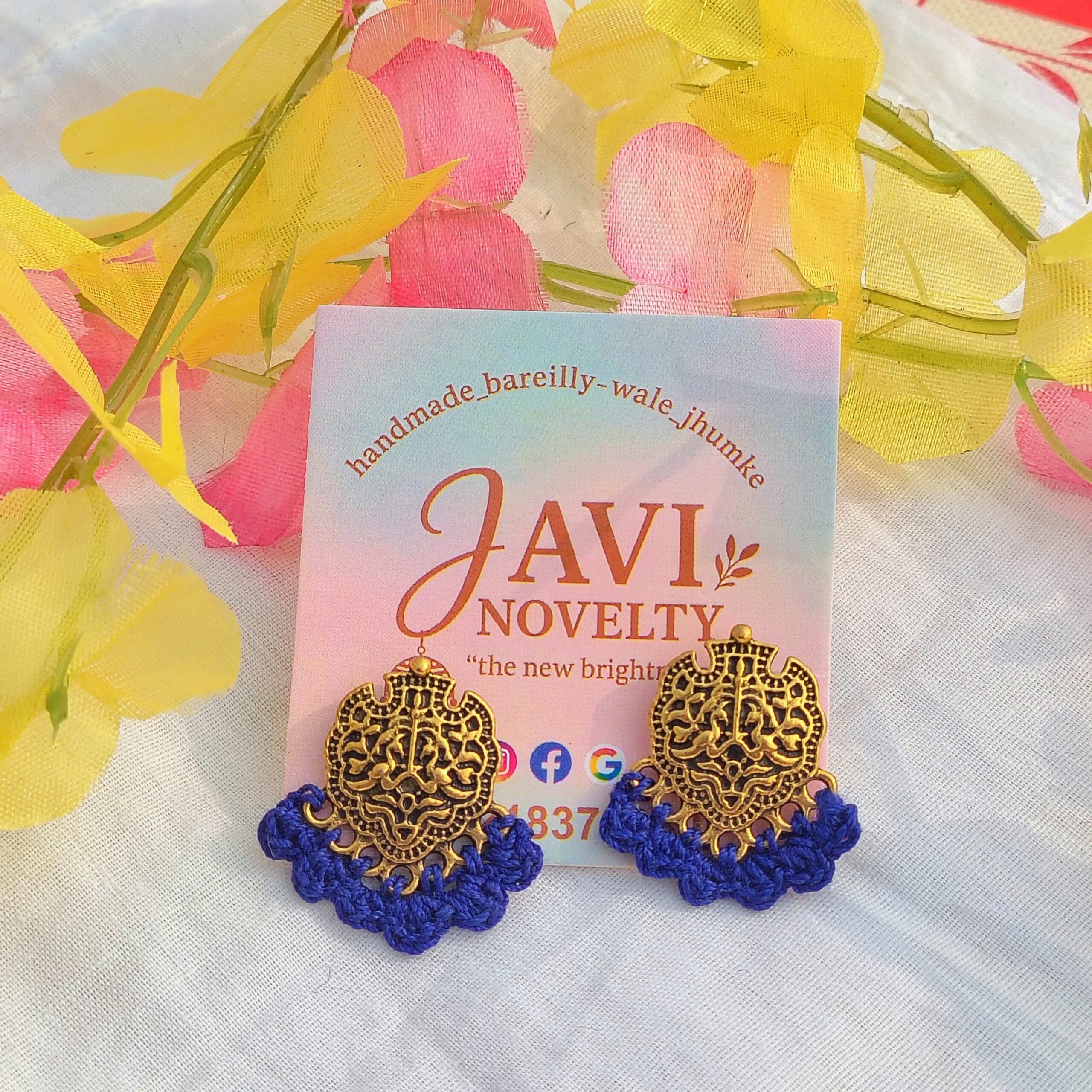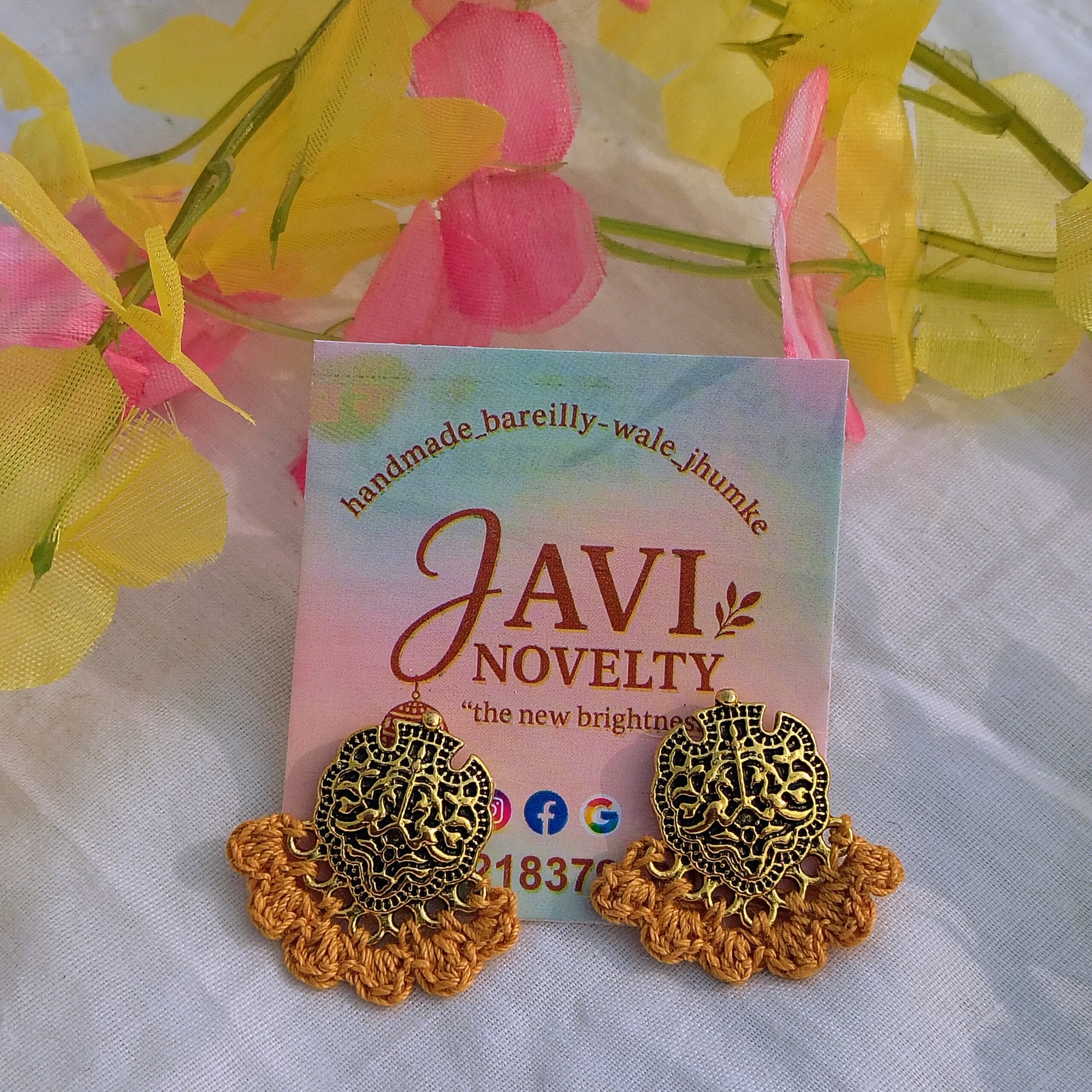 Add warmth and traditional charm to your look with these handcrafted Bareilly-wale jhumka earrings by JAVI Novelty. Featuring finely detailed oxidised metal motifs paired with handwoven mustard yellow thread, these earrings reflect rich Indian craftsmanship with a cheerful pop of colour.