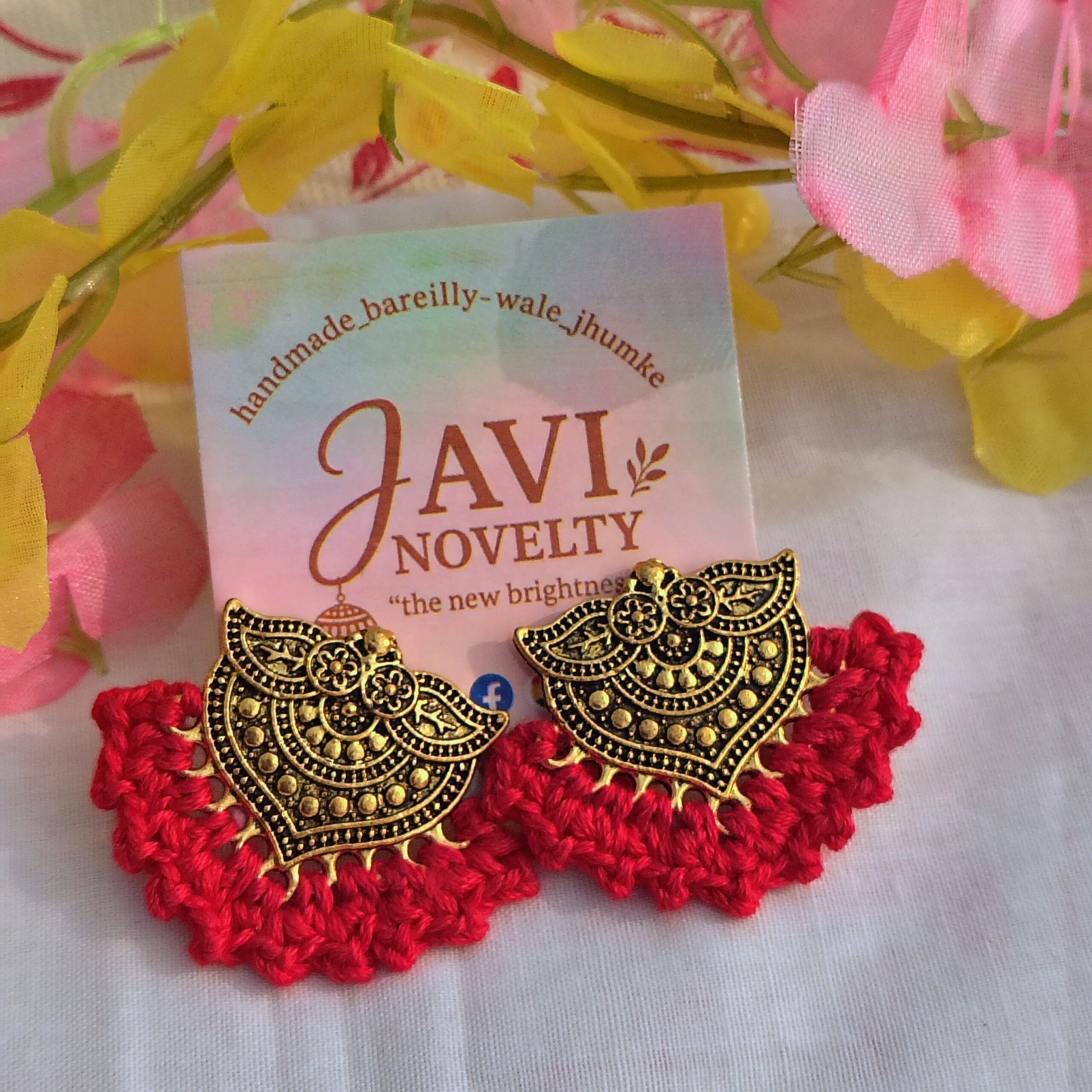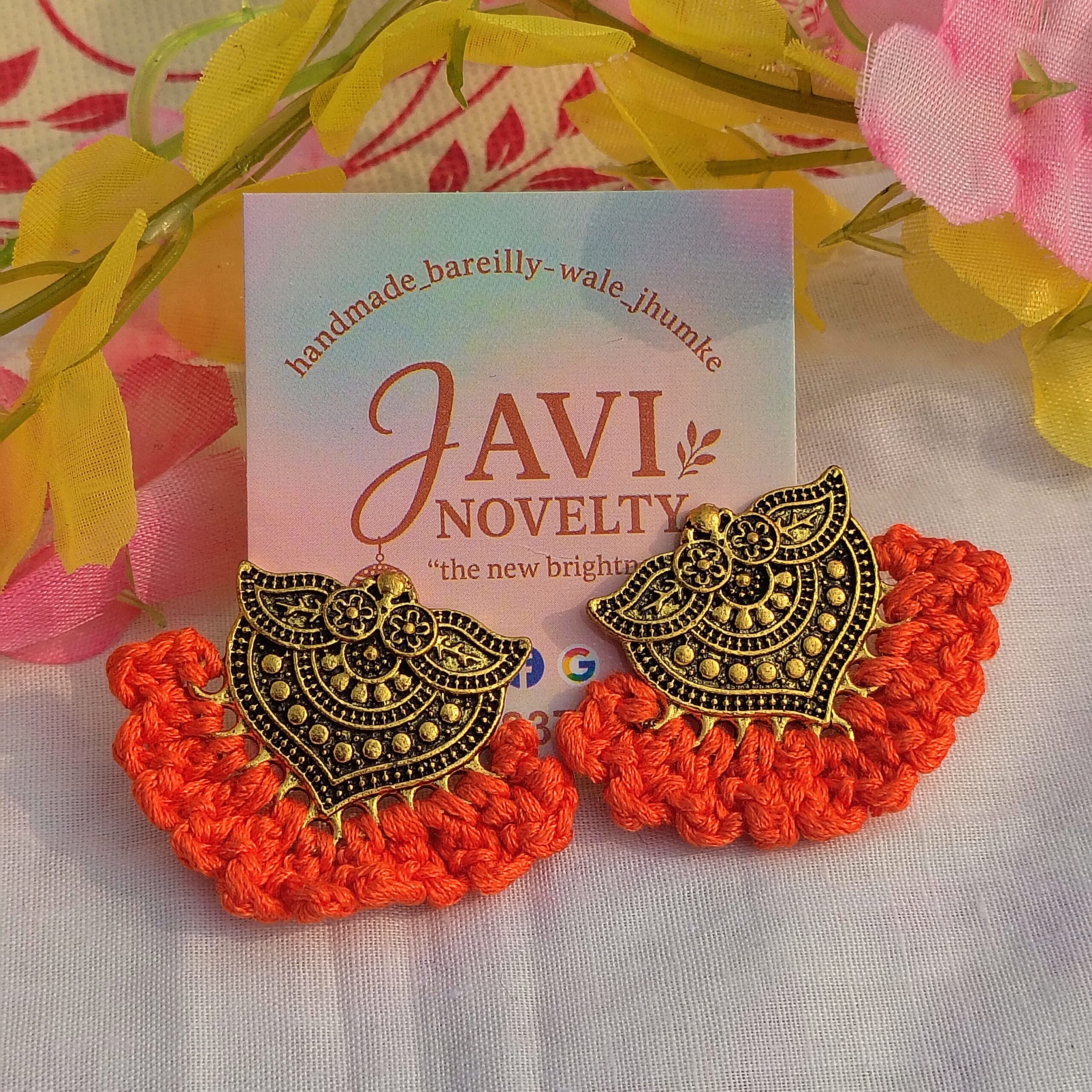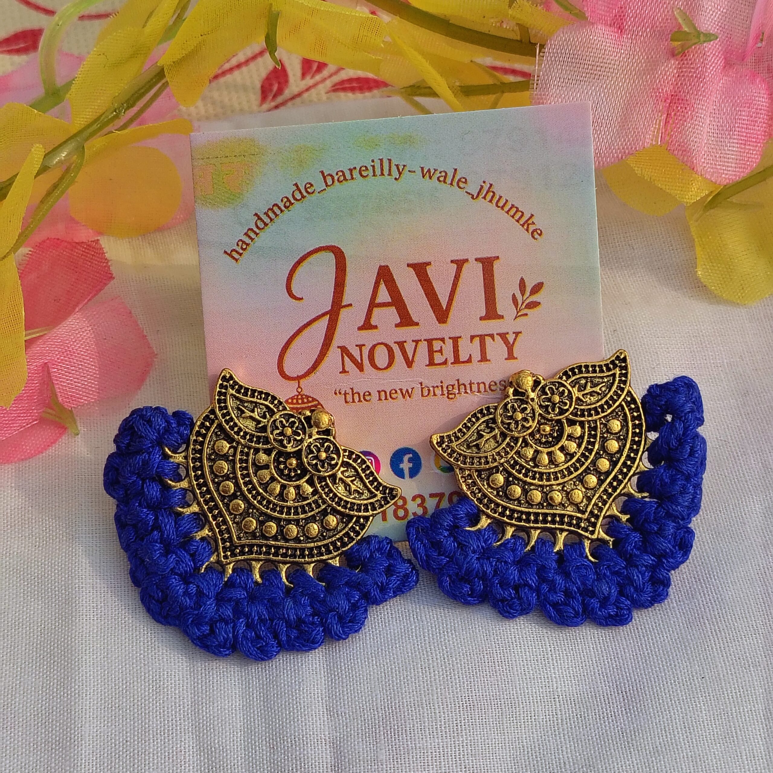 Make a bold yet graceful style statement with these handcrafted Bareilly-wale jhumka earrings by JAVI Novelty. Designed with intricately carved oxidised metal motifs and finished with handwoven royal blue thread work, these earrings beautifully combine traditional craftsmanship with contemporary colour appeal.
