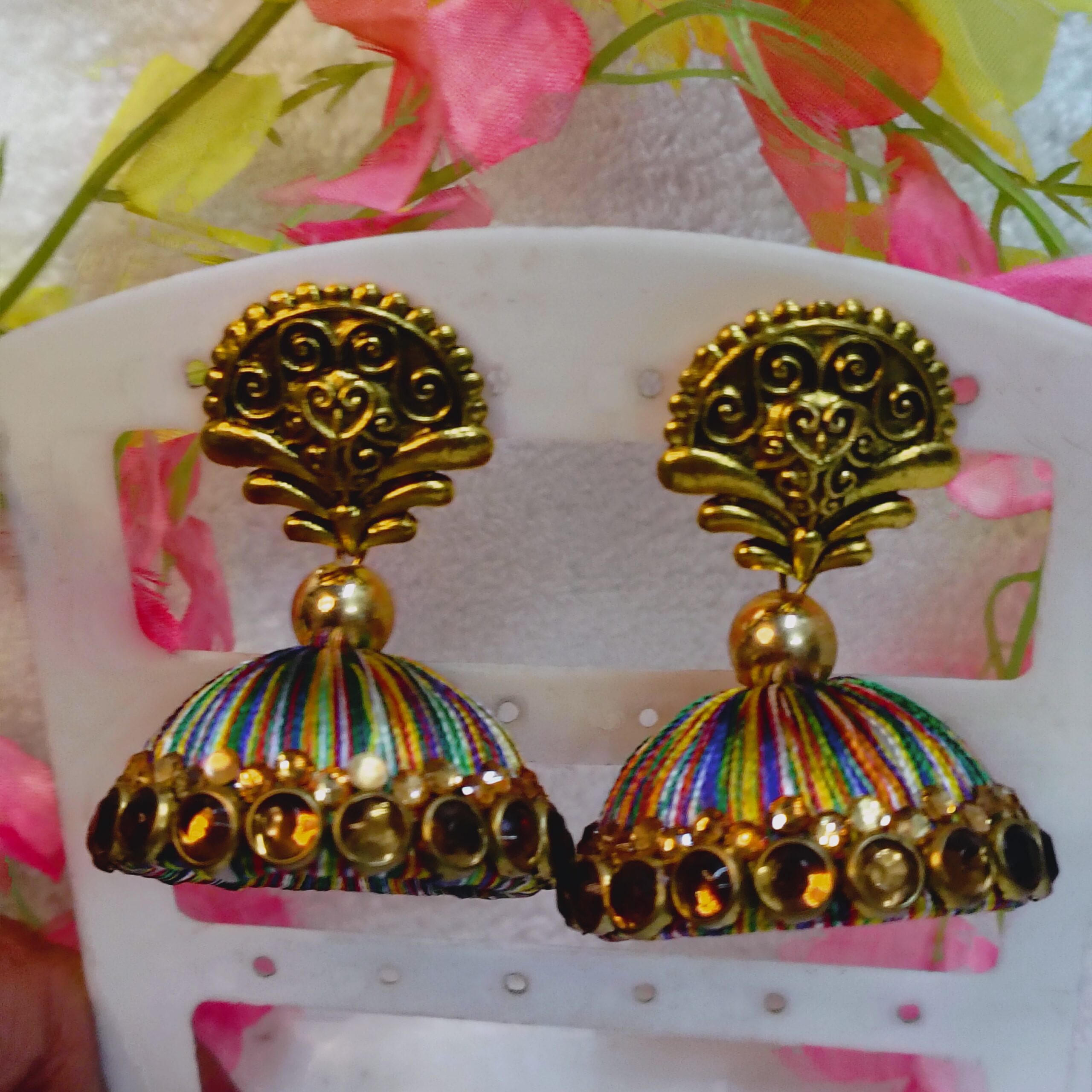 Vibrant handcrafted jhumka earrings featuring multicolour silk thread domes, antique gold-toned studs, and crystal embellishments. A perfect festive statement piece with a rich traditional touch.