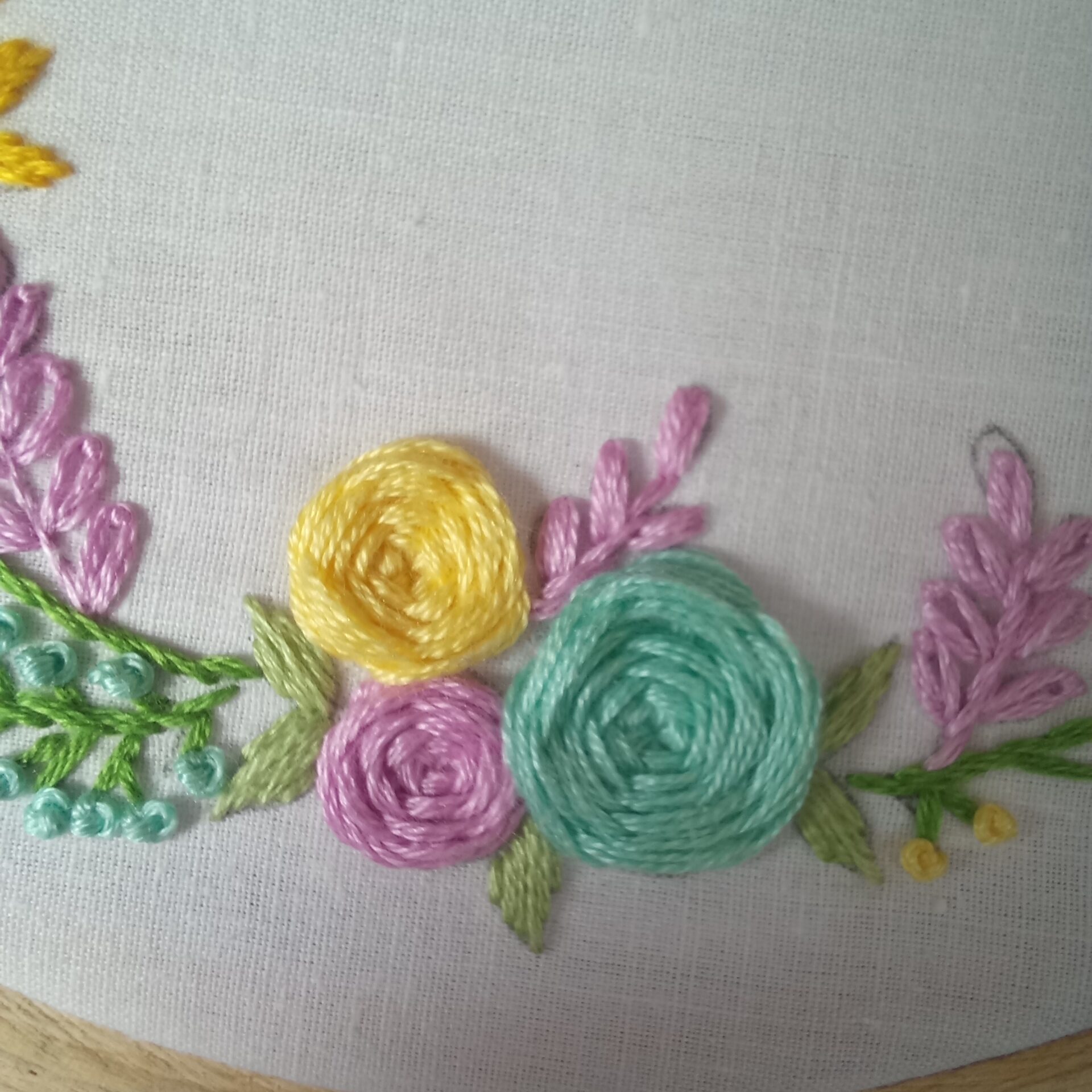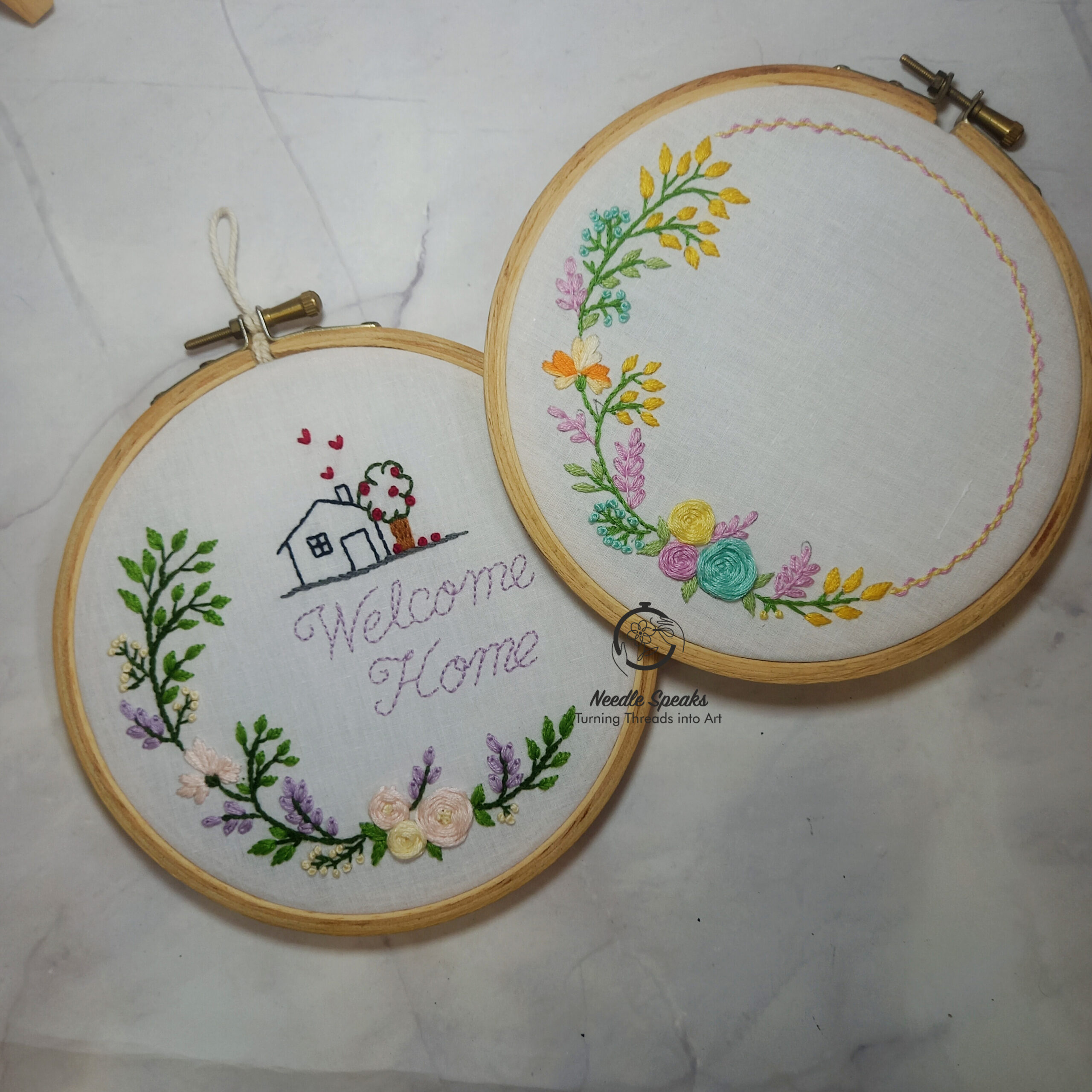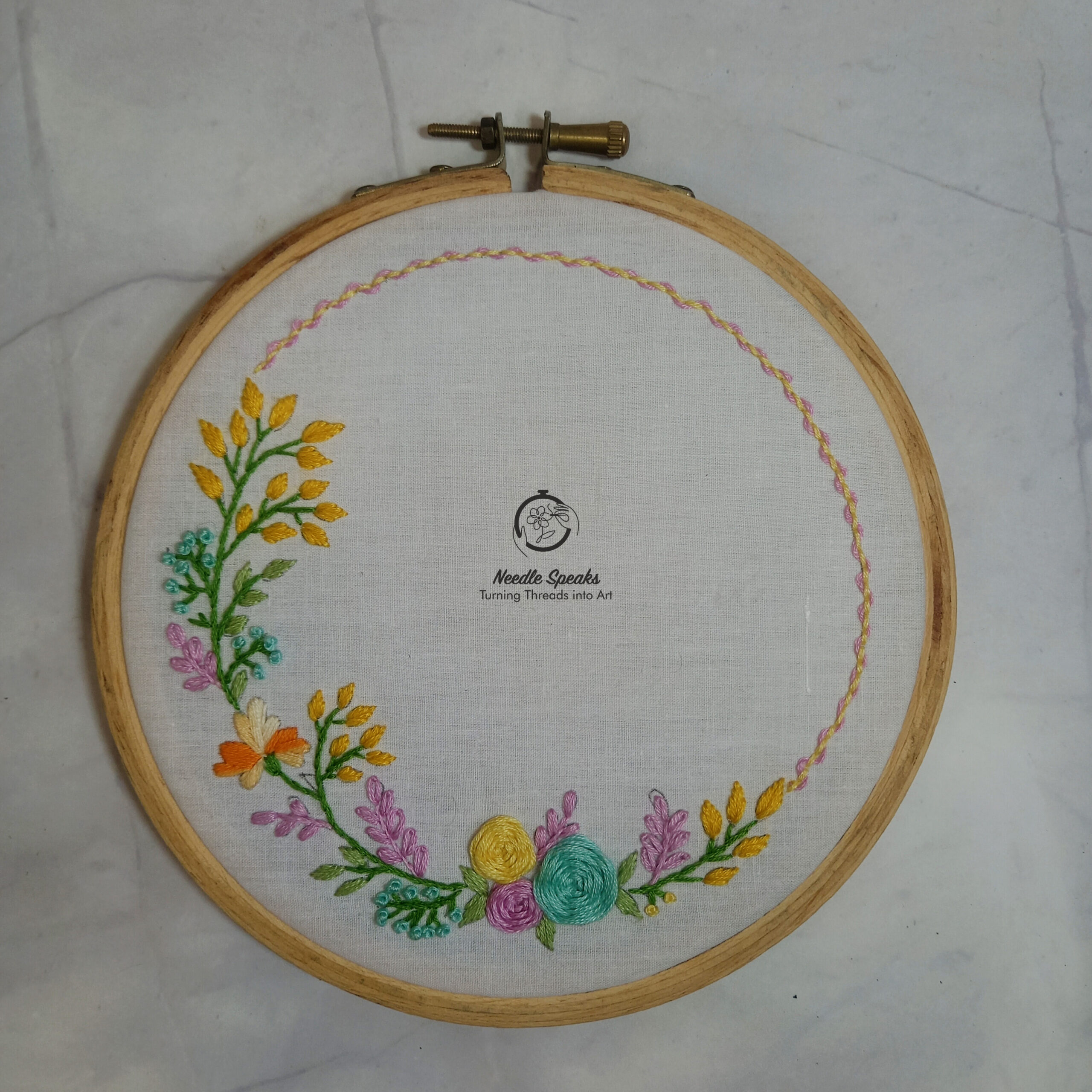 Elegant and beautiful, floral wreath hand embroidered using lovely shades of colors on off white casement fabric using 6″ brass screw round wooden hoop, finishing the border with thin line of veil embroidery.