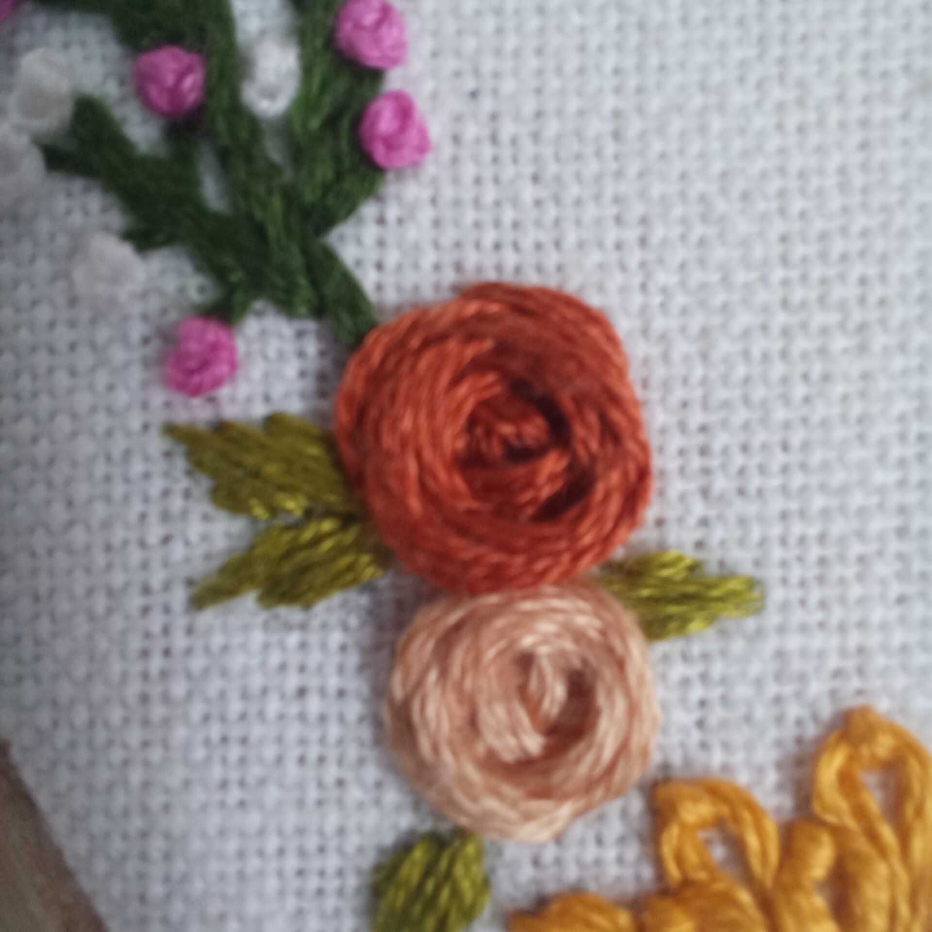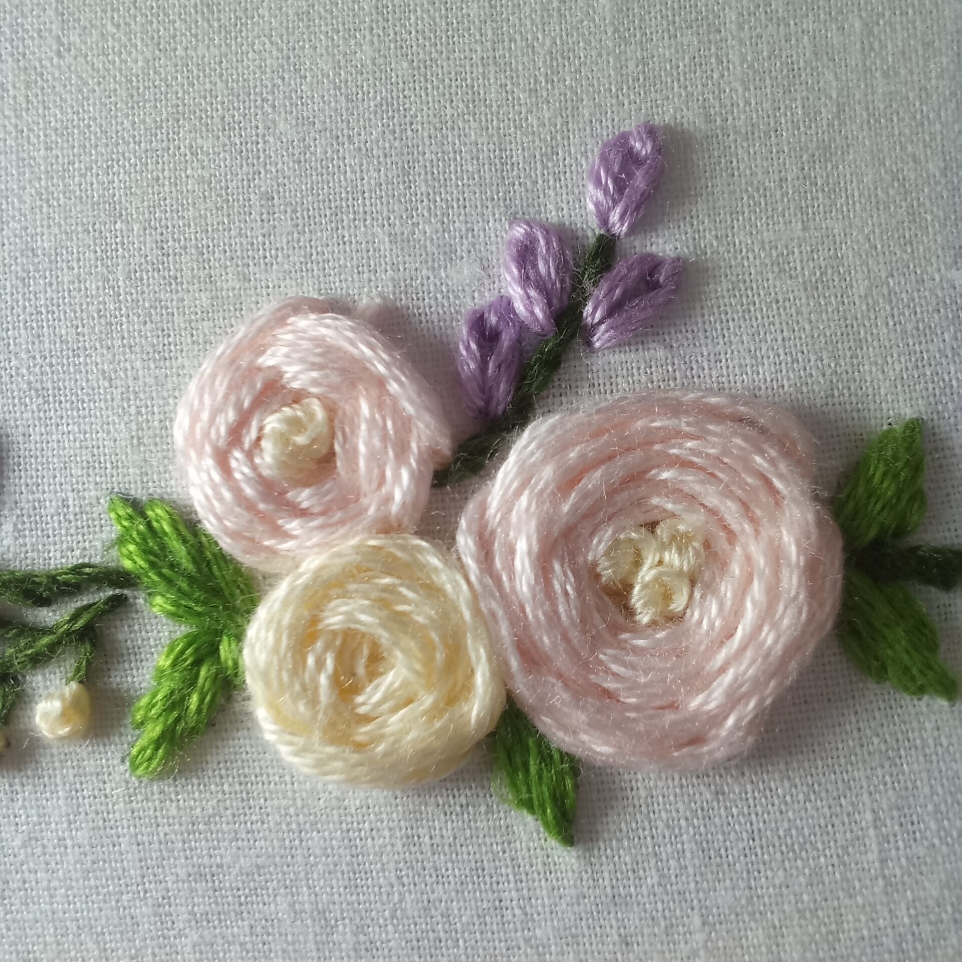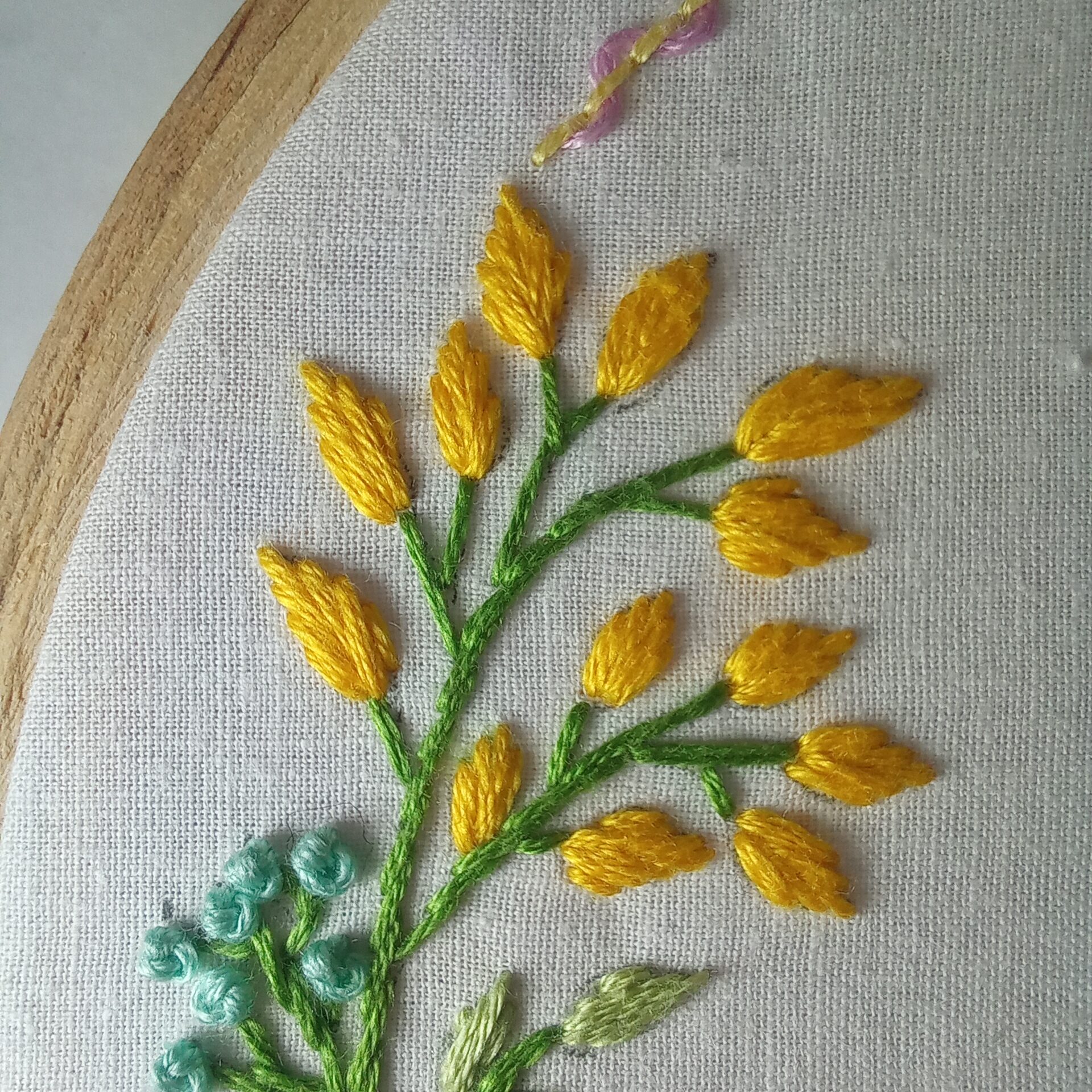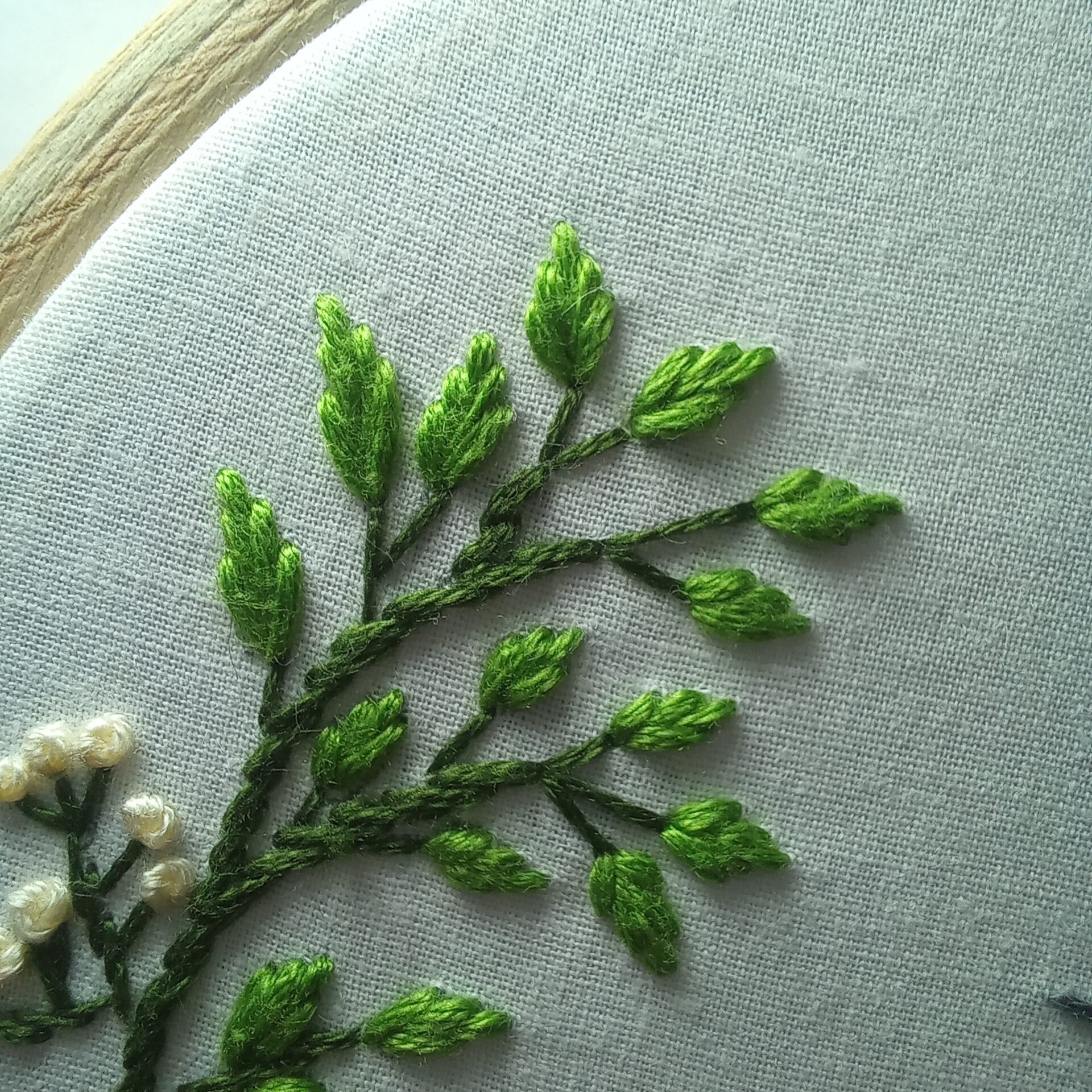 Elegant and beautiful, floral wreath hand embroidered using lovely shades of colors on off white casement fabric using 6″ brass screw round wooden hoop, finishing the border with thin line of veil embroidery.