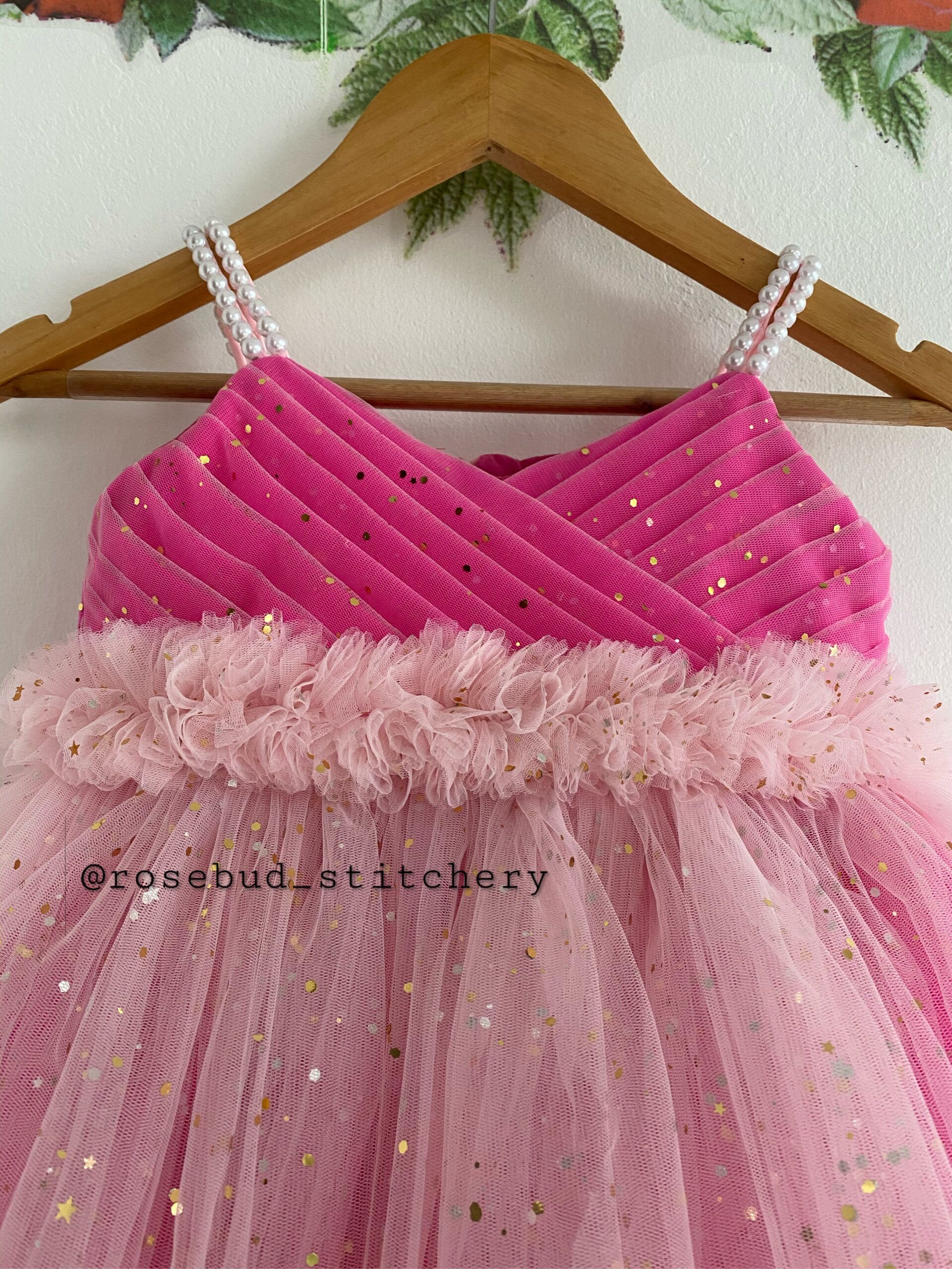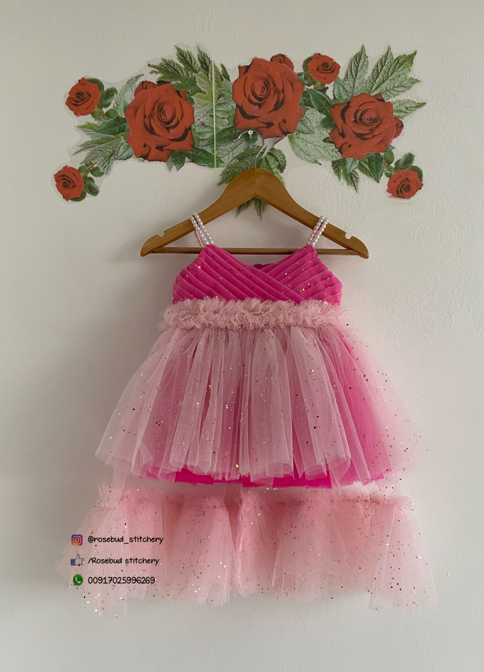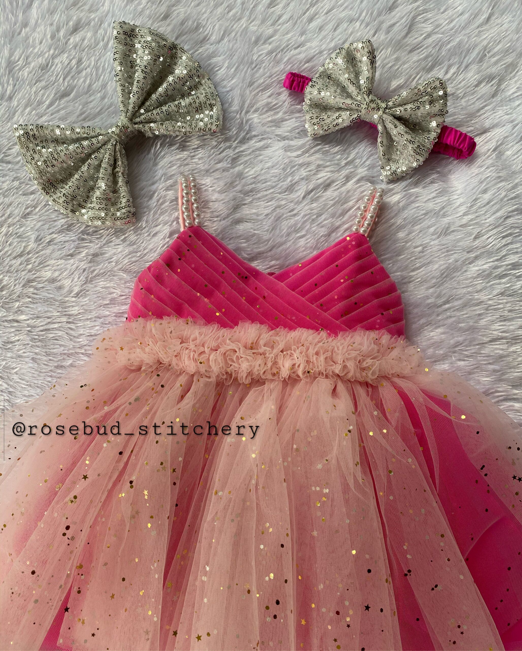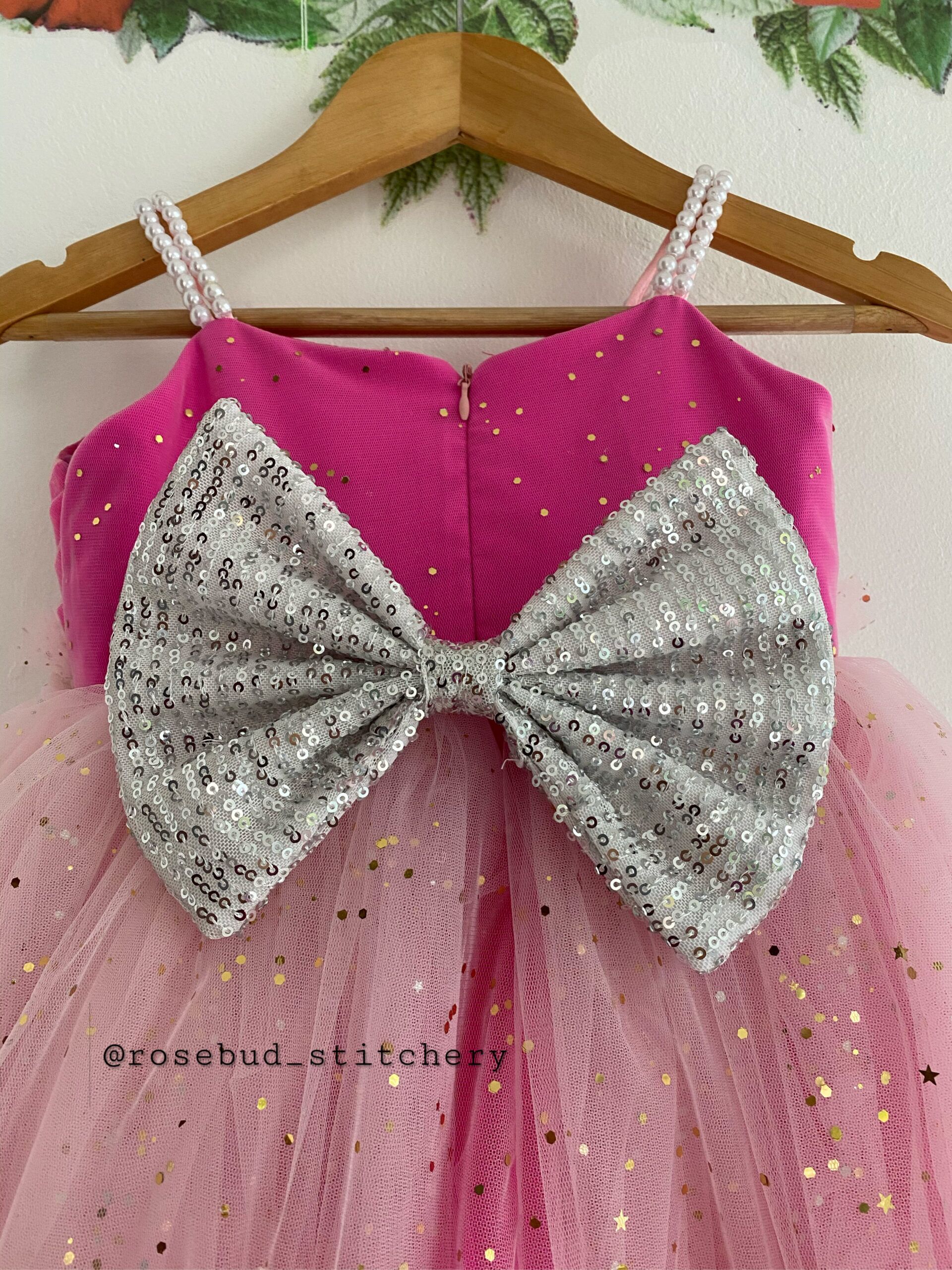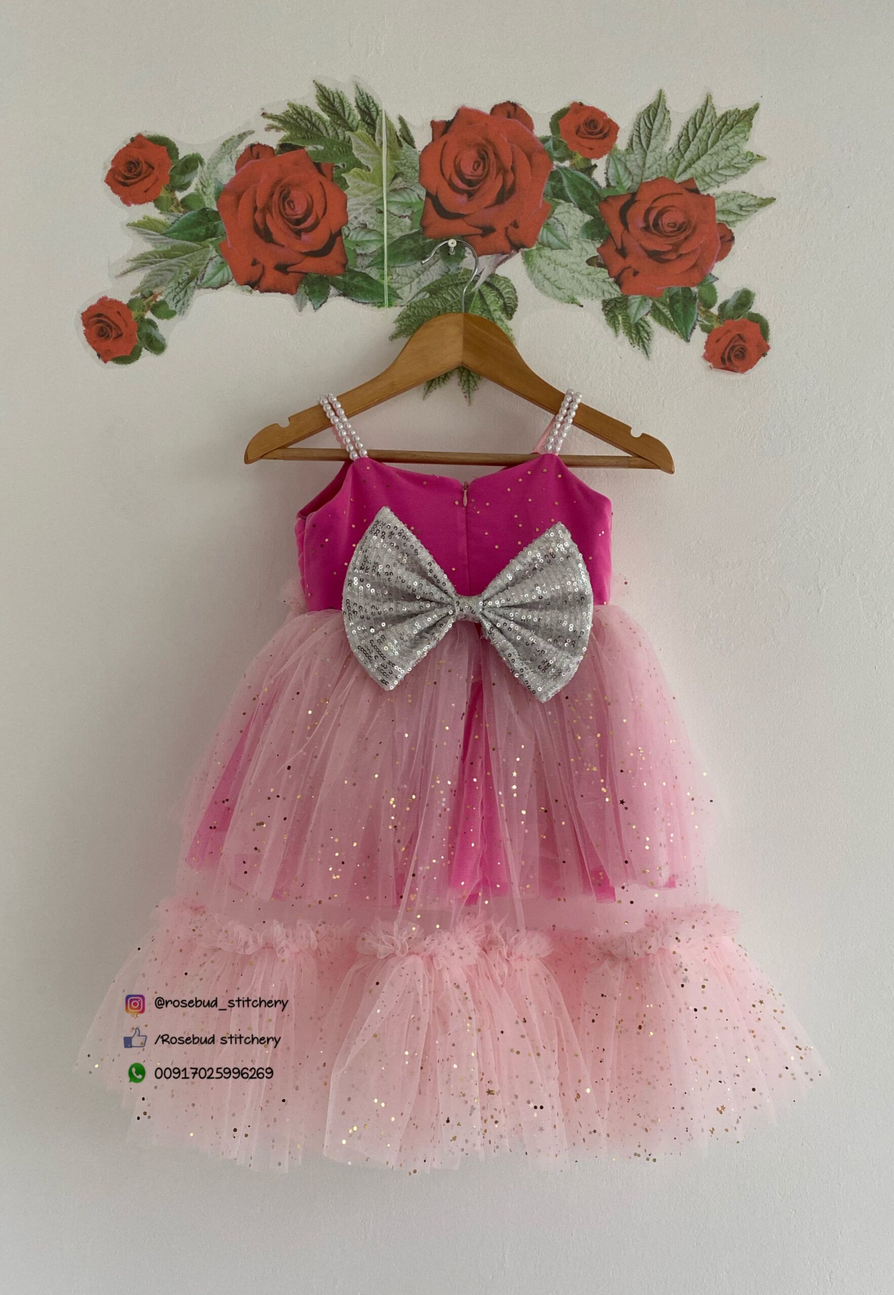 • Material – sparkle net – plain net combination high -low frock with silver detachable back bow.