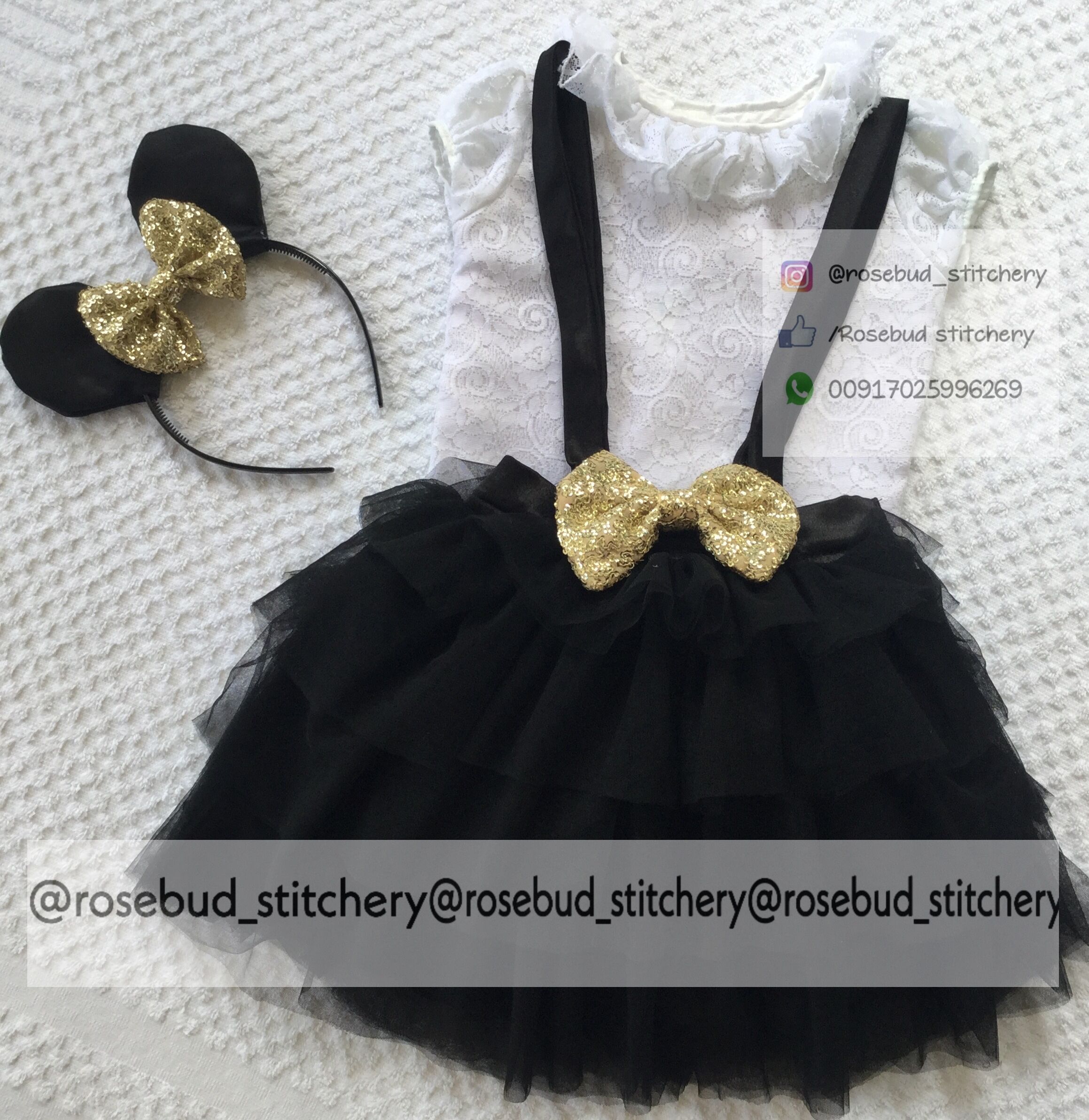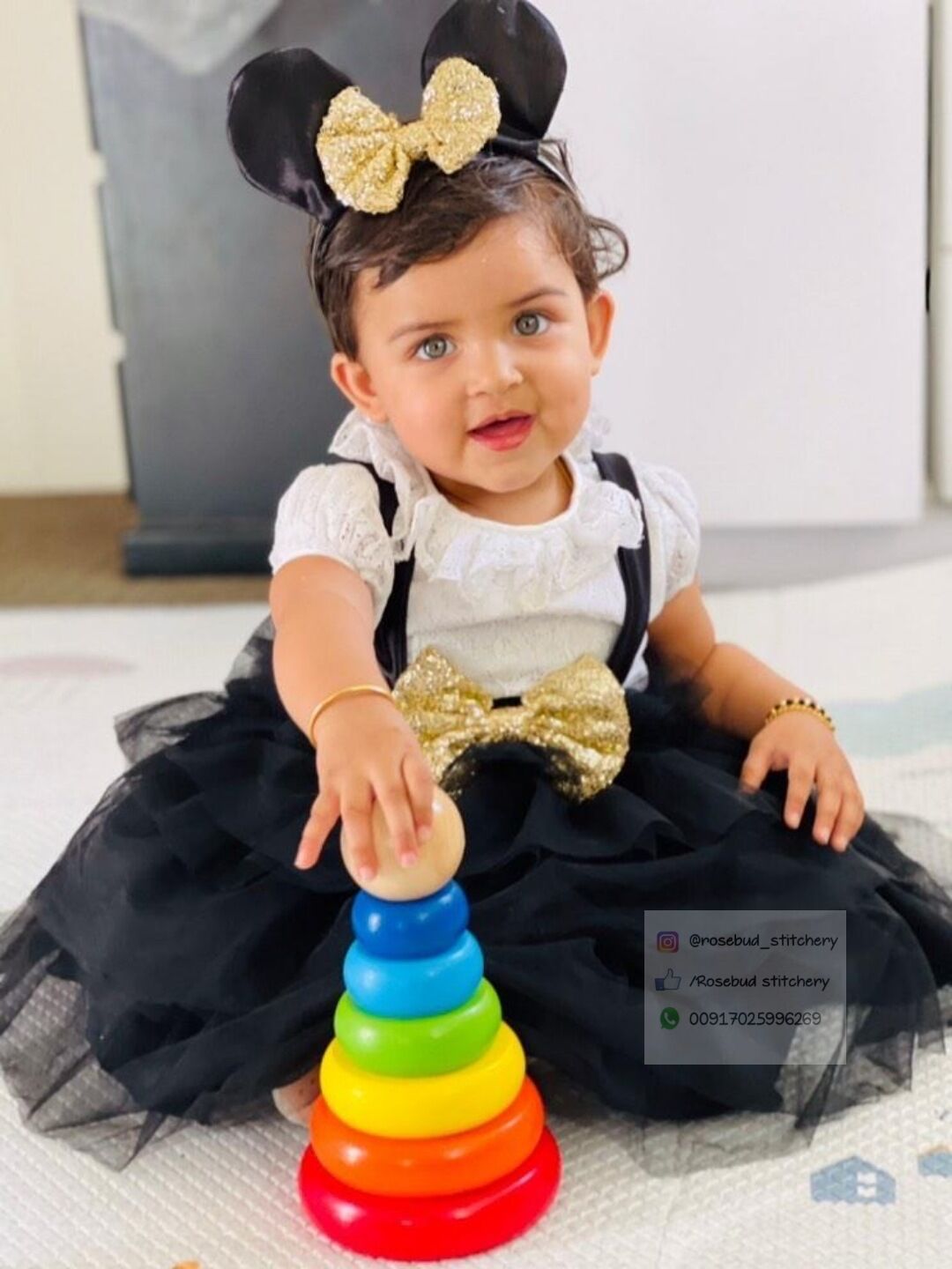 •Material – Black color tulle layered skirt , white cotton net top , front golden sequence fabric bow