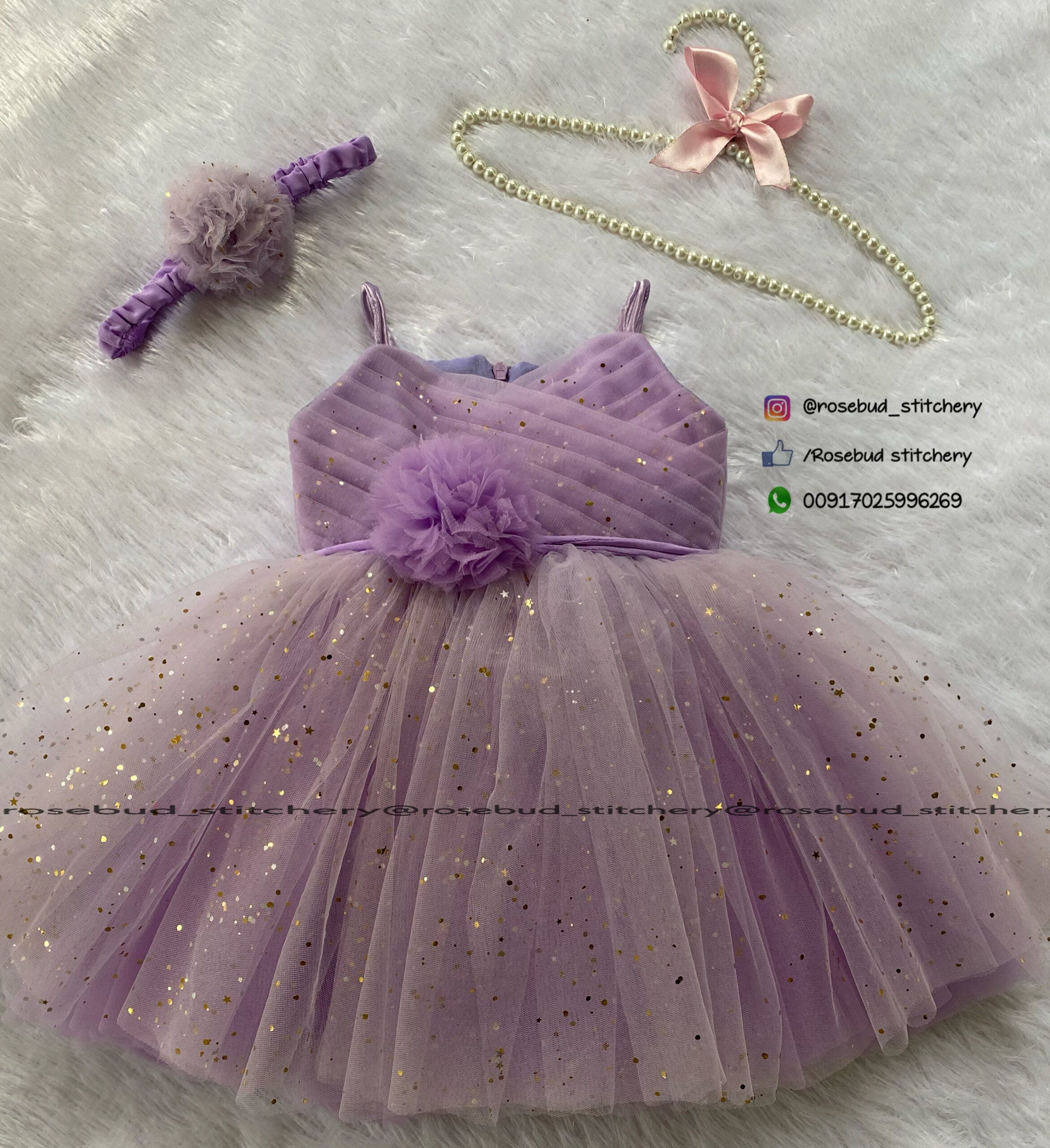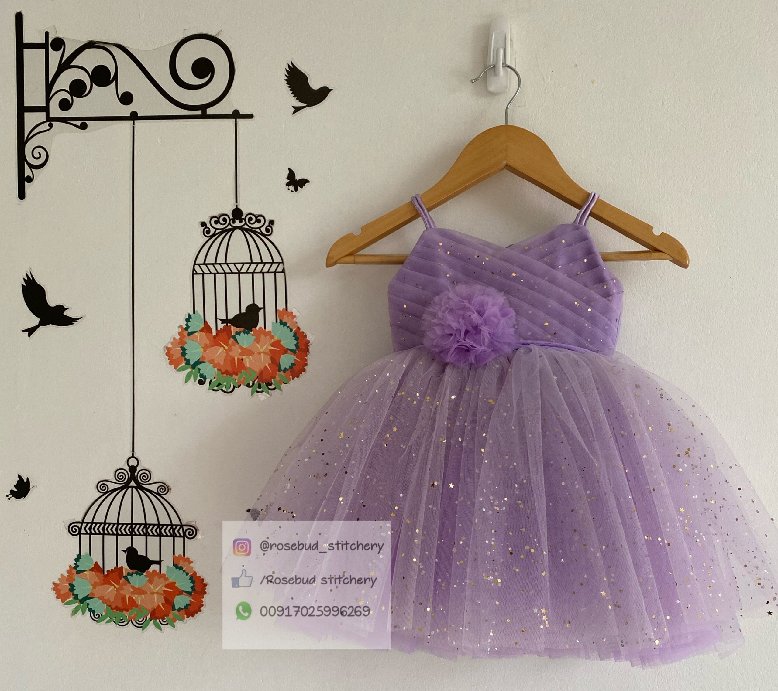 Lavander shade star sparkle cross pleted simple frock with pom- pom on waist