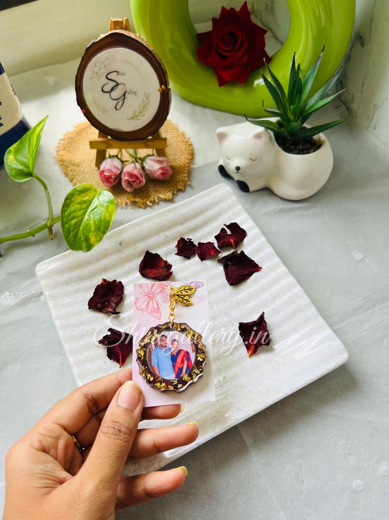 This beautiful floral keychain with your photo is made using layers of resin, with dried red rose petals and gold flakes.