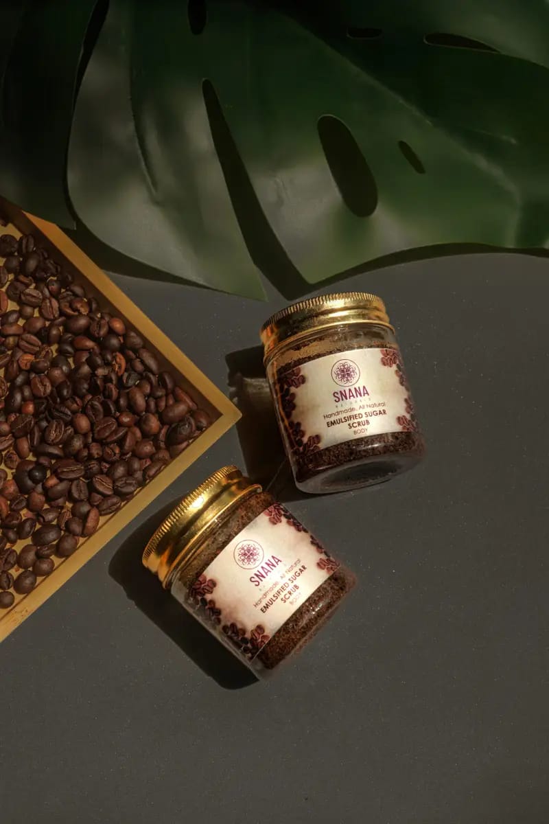 Sugar based emulsifying body scrub with rich aroma of coffee that will get your skin feeling fresh and beautiful. This coffee body scrub removes impurities and leaves skin clear and polished . With its rejuvenating & brightening formula , Snana body scrub leaves your skin feeling smooth and Nourished. The natural fragrance of coffee feels so divine , it will instantly uplift your mood.