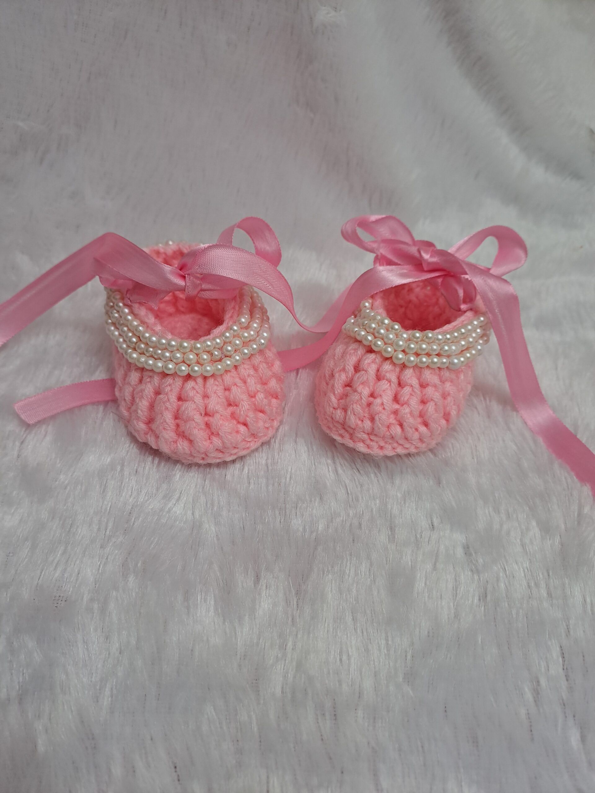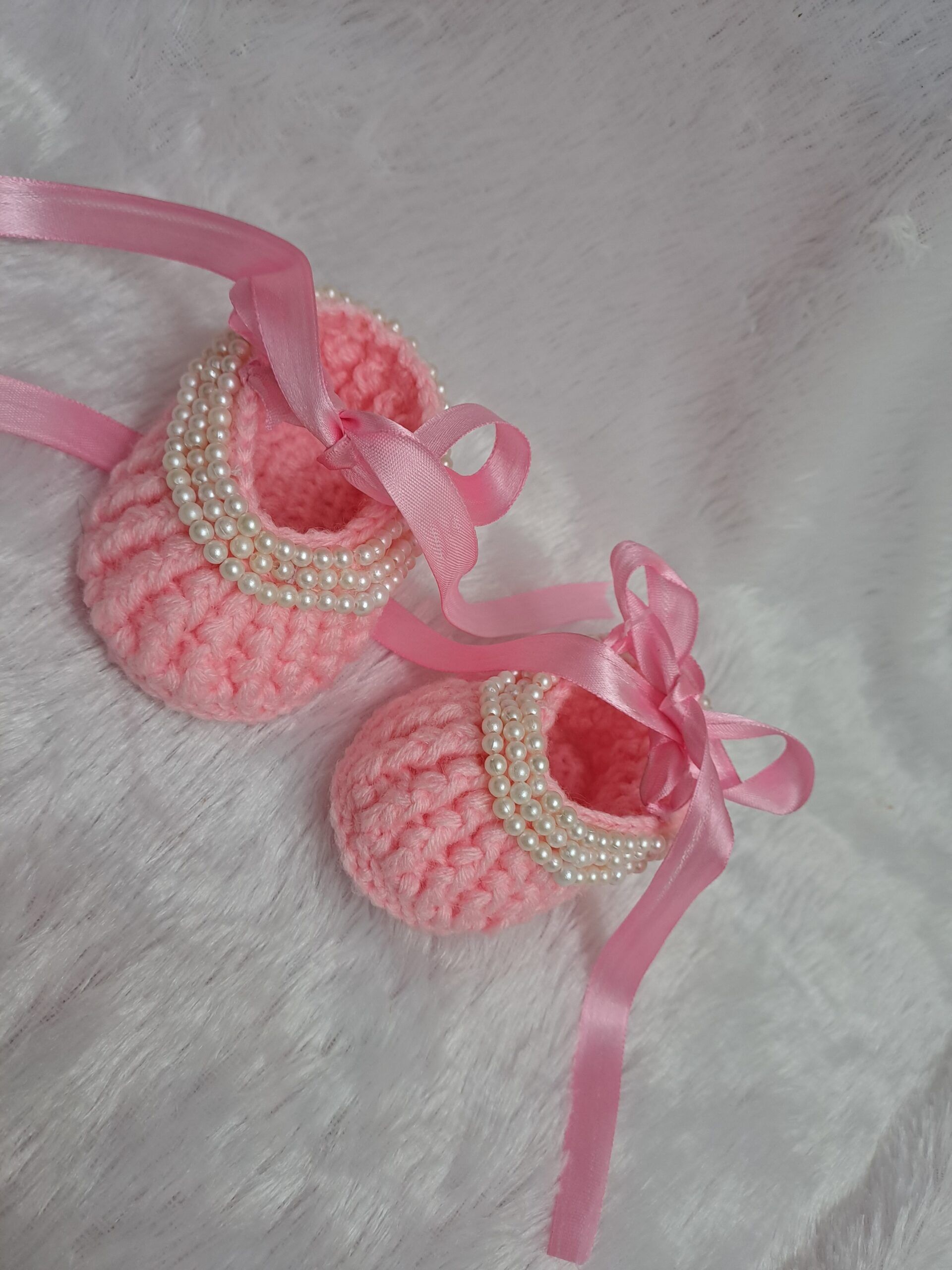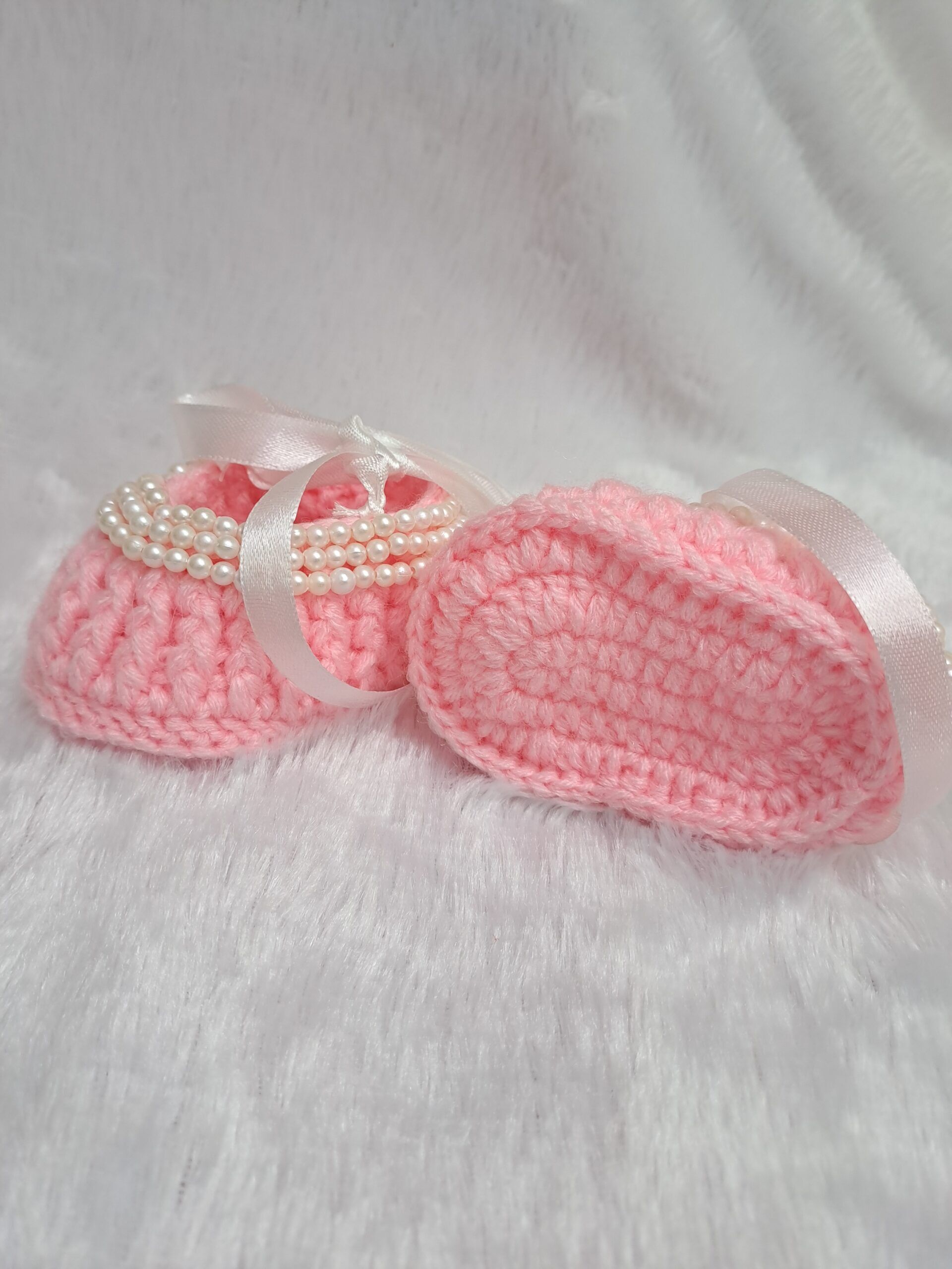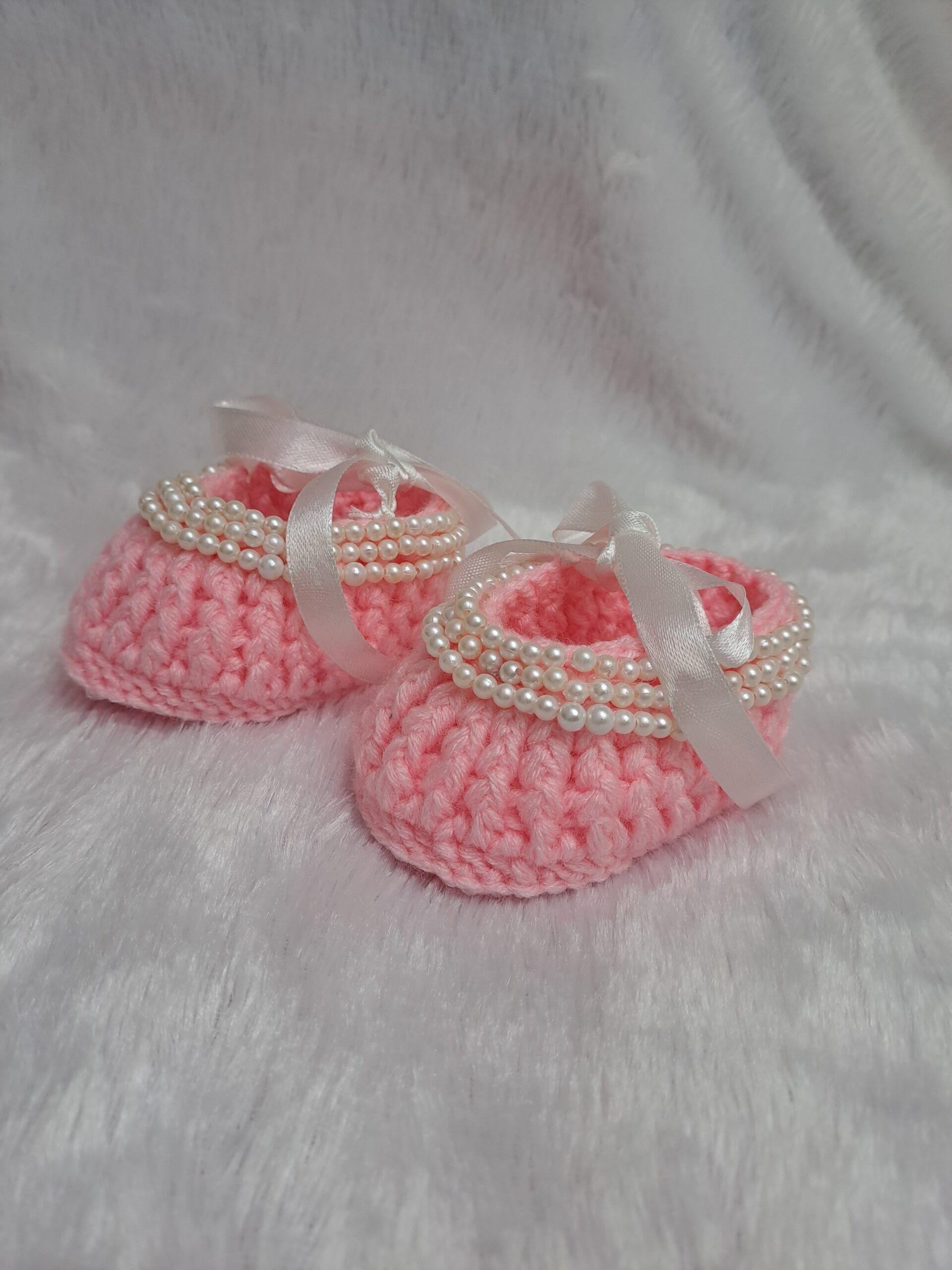 Cute baby booties with pearls made from child safe acrylic yarn.
