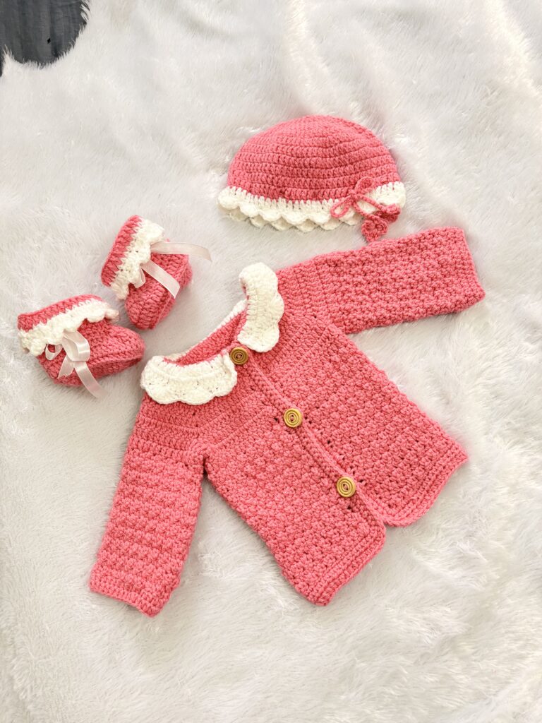 Made from branded, child-safe premium yarn, this pure white set is beautifully decorated with pink and green crochet flowers, adding a soft, elegant charm. Each piece is designed to provide warmth, comfort, and style — perfect for baptisms, photoshoots, or special occasions.