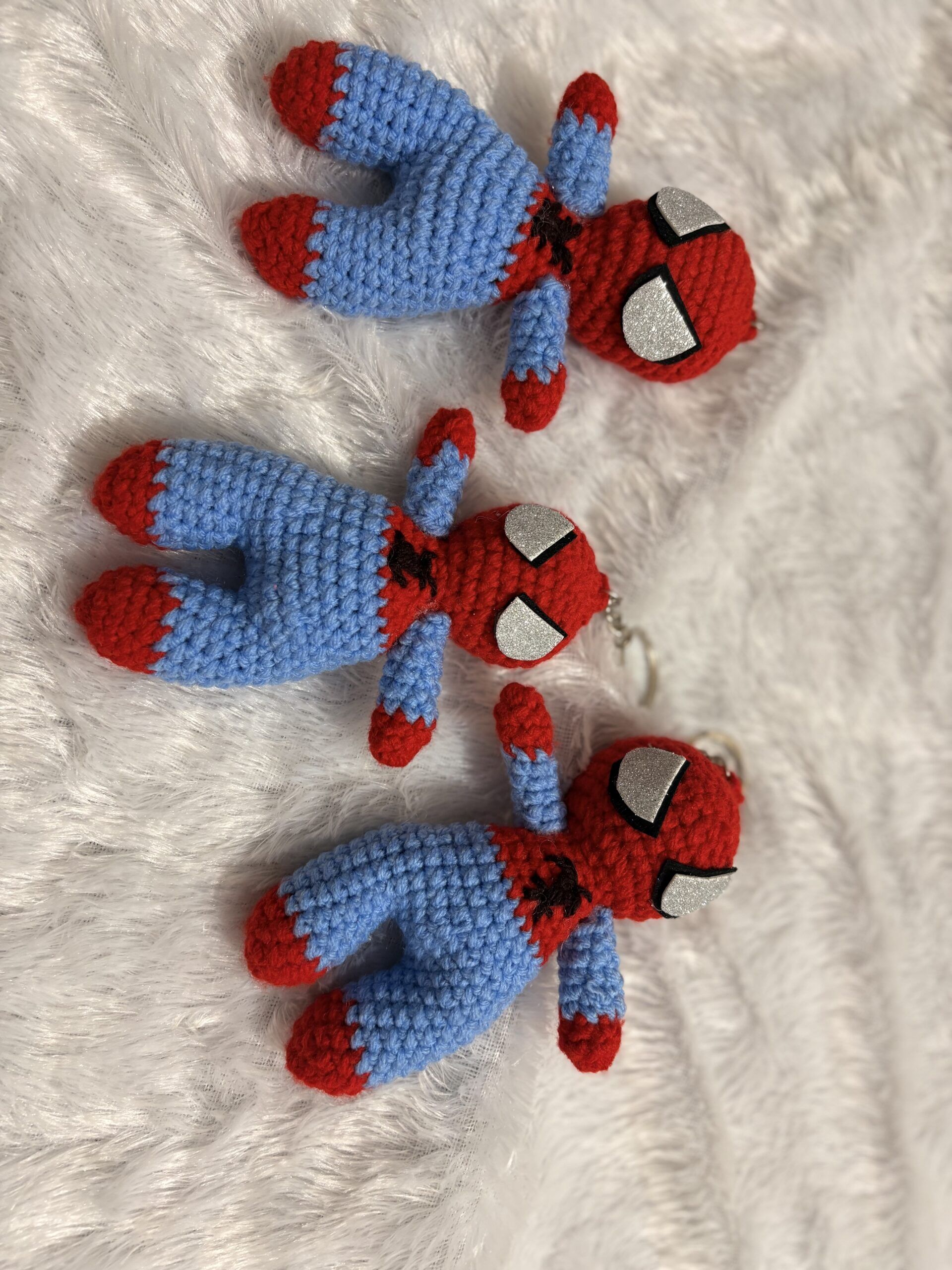 “Crochet Cute Spiderman Keychain — 5 inches tall, handcrafted with premium branded yarn for durability and a soft finish. This adorable mini hero adds a fun touch to your keys, bags, and car mirror. Lightweight, sturdy, and made with child-safe materials. Comes with a secure metal keyring and optional name tag or charm add-ons for a personalized touch.”