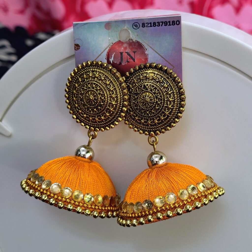 note: - kindly cross-check with the multi-color shades available in silk thread jhumka earrings, as well as thread shades available for crochet earrings before placing any order.